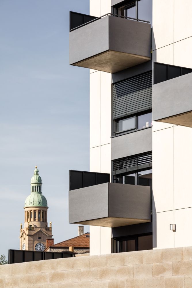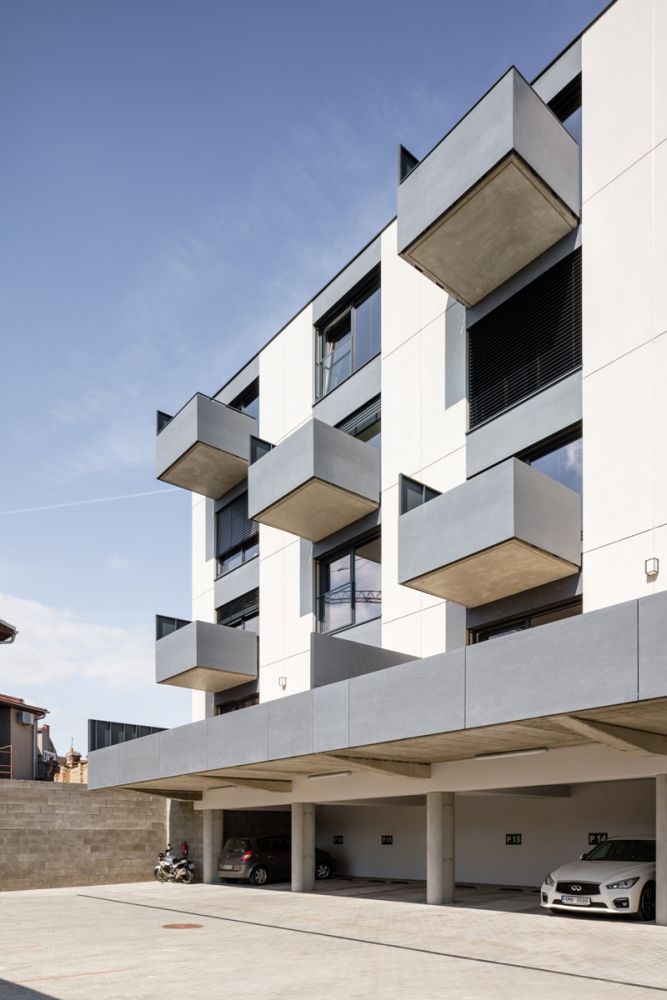 rastrem oken, dvorní část oživuje rytmická hra velkoryse předsazených balkonů.