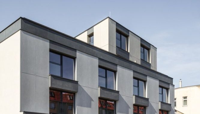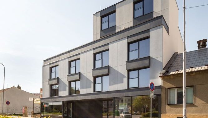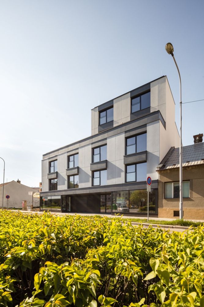 a antracitové. Uliční fasáda je členěna horizontálními římsami a pravidelným