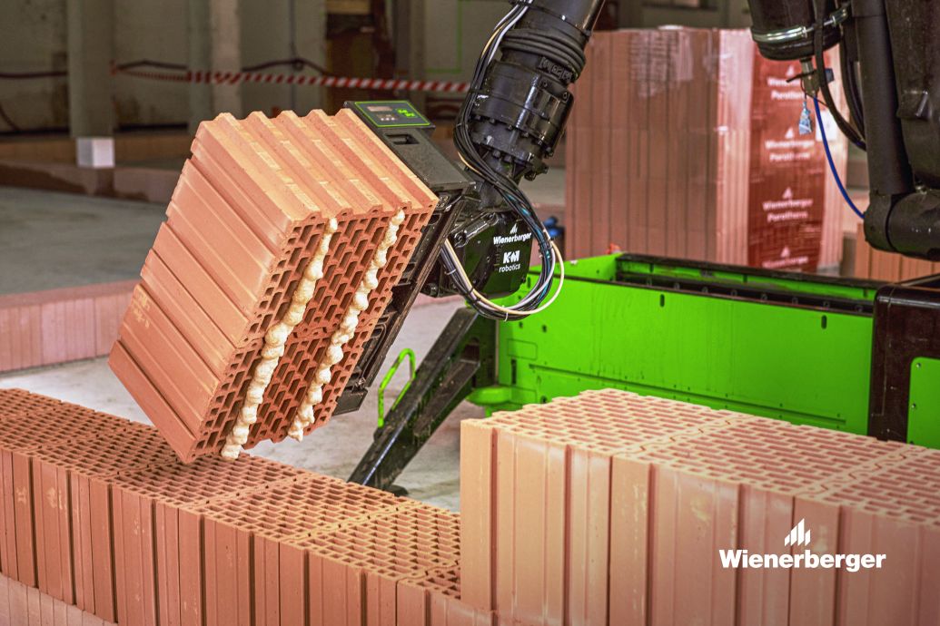 Ke štěstí mi stačí moje speciální cihly – Porotherm 30 RR Profi Dryfix. RR znamená robot ready, protože tyhle 30 cm silné cihly mají z čelní strany speciální drážky upravené tak, abych je mohl uchopit a přesně umístit do zdi. Používám je pro vnitřní nosnou část vrstveného zdiva v kombinaci s tepelným izolantem a případně s dalšími cihelnými materiály tvořícími vnější ochrannou část stěny. K sobě jednotlivé bloky spojuji zdicí pěnou Porotherm Dryfix, kterou nanáším ve dvou pruzích stejně spolehlivě, jako to dělají lidé.