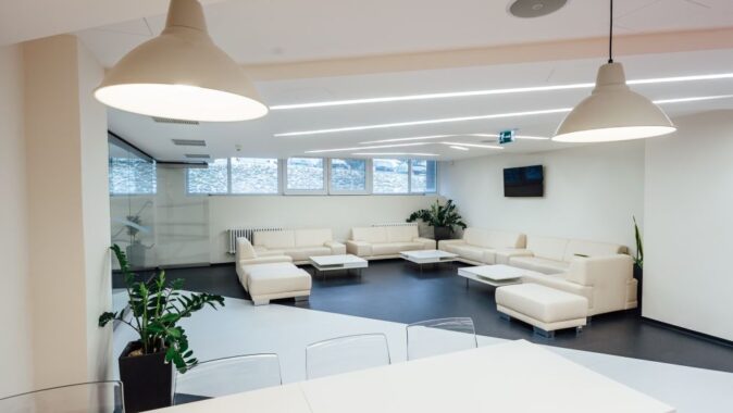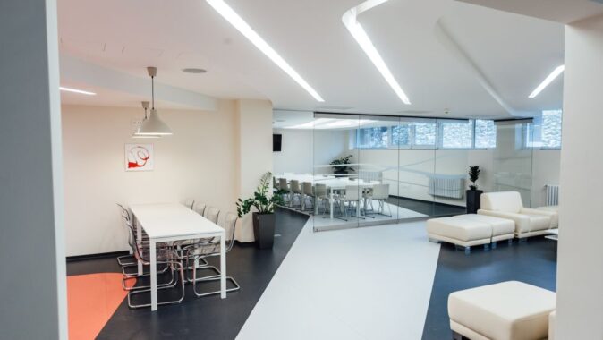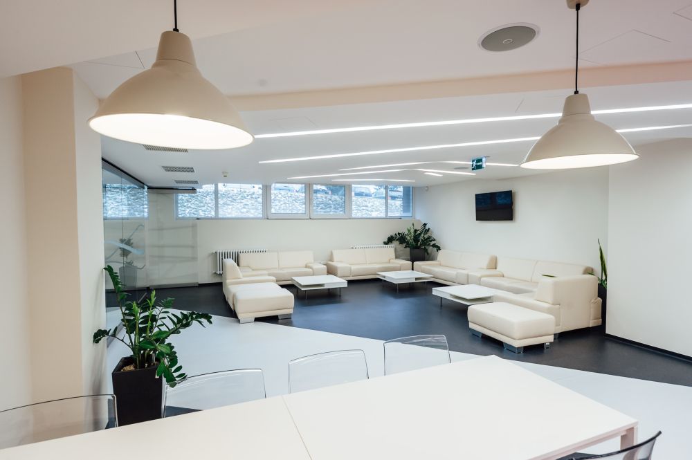 přednáškový sál, neformální klidová část a jídelní část s barem a kuchyňkou.