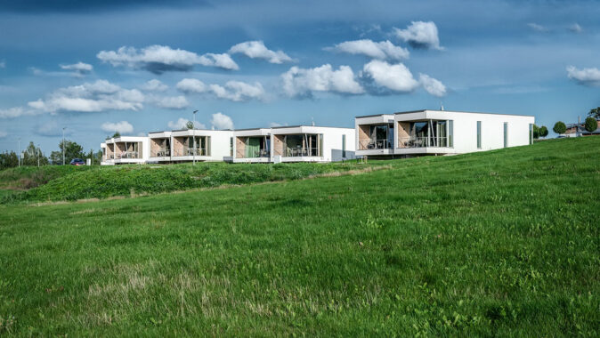 Pro design domů s plochou střechou je typická jednoduchá linie a prosklené průčelí s konzolou zastřešené terasy. Bílé fasády doplňují kamenné sokly a dřevěný obklad v prostoru terasy. Osou domu prochází krytý průchod, z něhož se vstupuje do apartmánů. Na něj navazují společné prostory skladu a technické místnosti. Do apartmánu se vstupuje přes prostornou předsíň, z níž jsou přístupné ostatní místnosti. Obývací pokoj s výhledem je prosklenou stěnou propojen s krytou terasou.