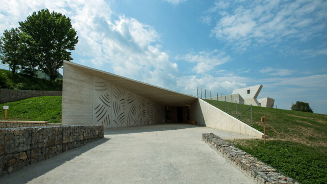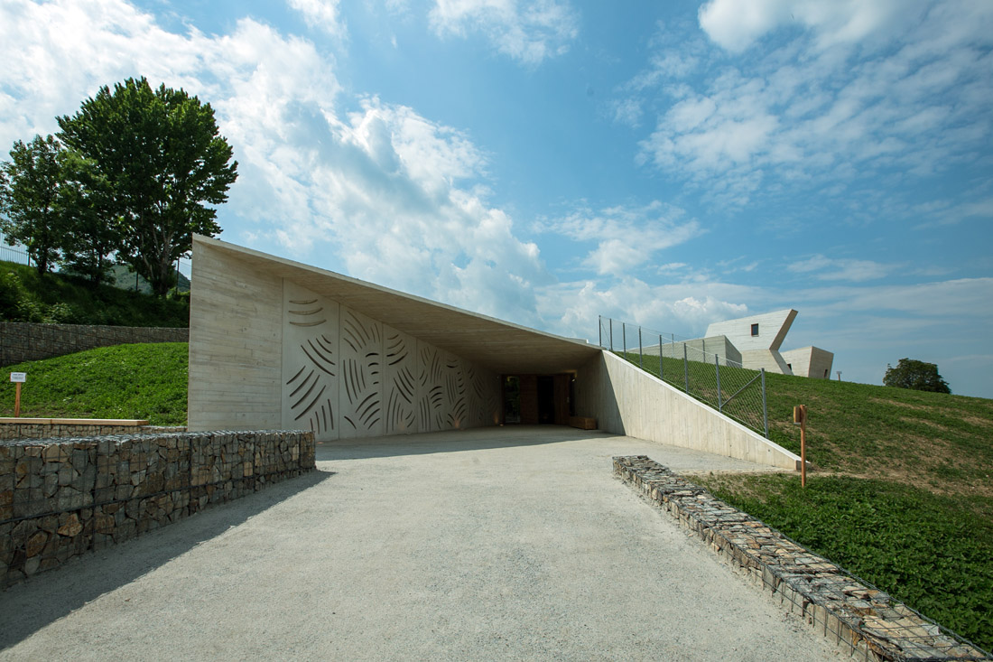 Pokud se jedná o materiály, rozhodli jsme se pro monolitický reliéfní beton, dubové dřevo a sklo. Vstupní prostor vymezují gabionové zdi.“ říká architekt Radko Květ.