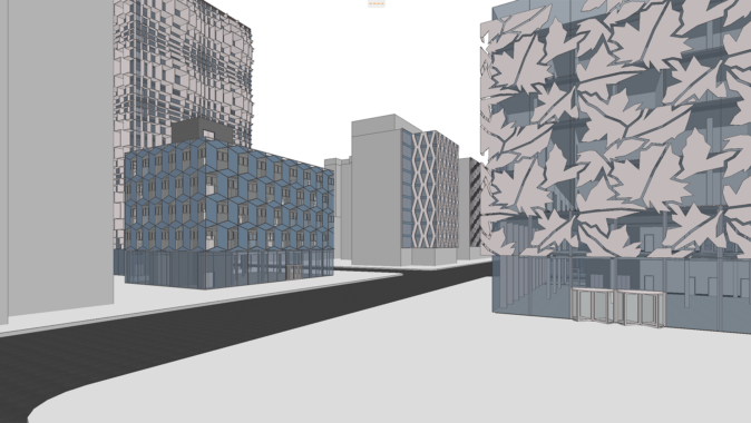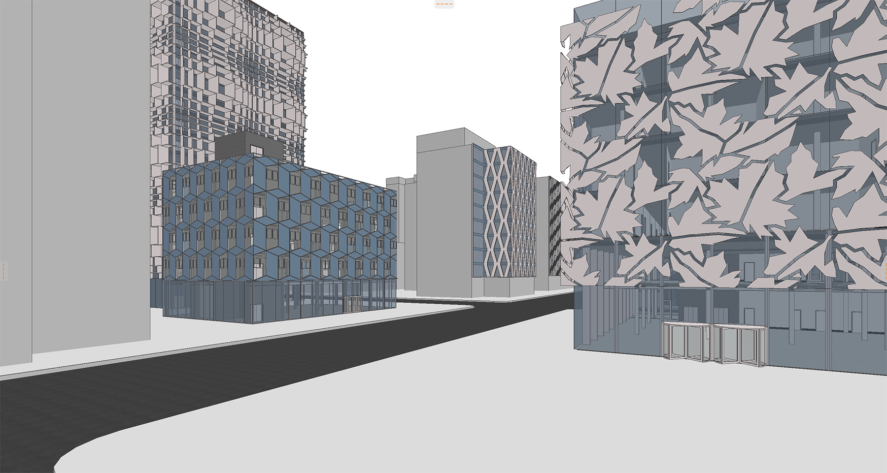 způsobem vymodelovat a následně zdokumentovat opláštění budov, a to tak, aby