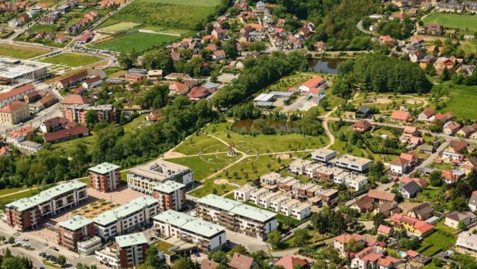 s náměstím a parkem, škola s tělocvičnou, základní umělecká škola,