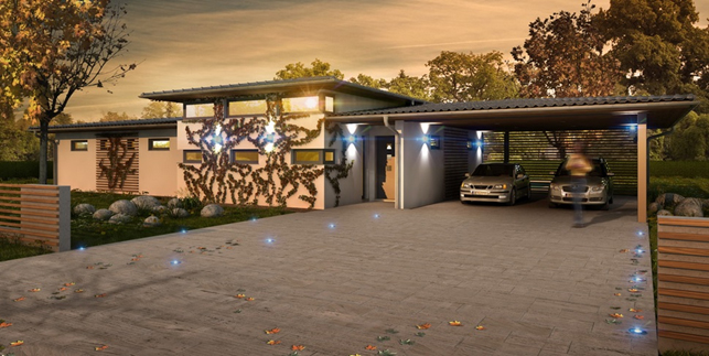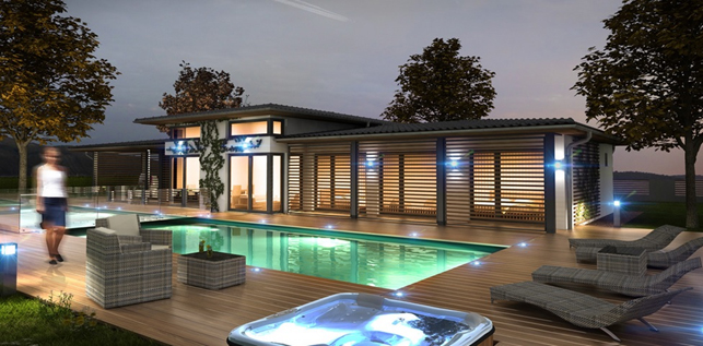 Projekty bungalovů patří v současnosti k nejpopulárnějším novostavbám. Prostornost přízemního domu výborně ladí s vysokým stropem ve společenských prostorách. Dostatek světla zajišťují velká okna a přispívají k už tak dobré vzdušnosti prostoru. Výhled z obývacího pokoje propojuje obytnou část se zahradou a vizuálně rozšiřuje prostor domu až k nekonečnu. Umístění terasy s bazénem volně navazuje na pohled z ložnice a dětského pokoje. Soukromí a stín v letním žáru zajišťují dřevěné žaluzie. Podlouhlý tvar domu příjemně odděluje čelní stranu s vchodem a garáží od části odpočinkové se zahradou. Mírný sklon valbové střechy, který je pouhých 11°, je pak vhodným kompromisem k plochému typu. Elegantní a nadčasový dům zkrátka potěší každého, kdo má rád přiměřenou porci luxusu při zachování inteligentní dispozice obytné části.