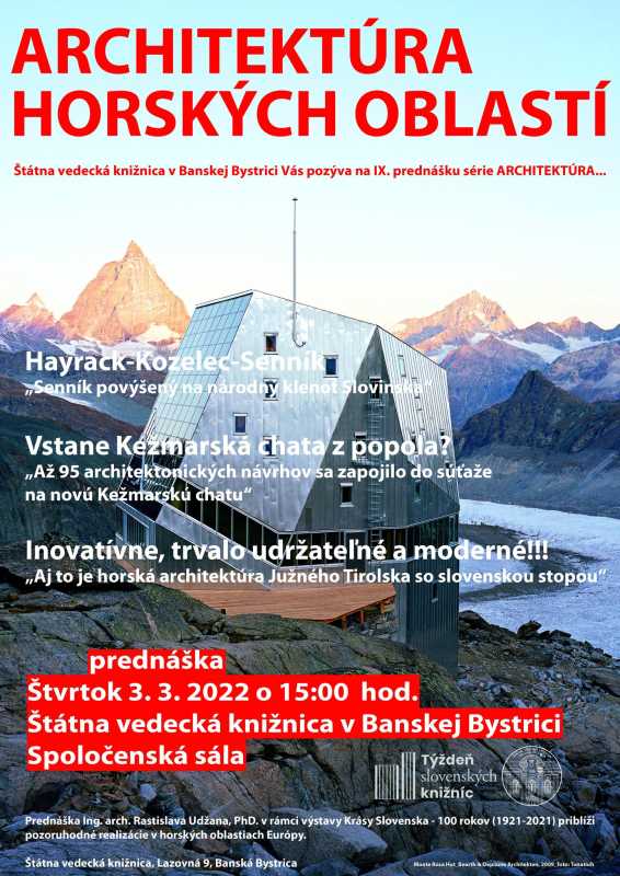 V rámci výstavy 100 – ročnice časopisu Krásy Slovenska (1921-2021) aktuálne prezentovanej v Štátnej vedeckej knižnici v Banskej Bystrici, sme pripravili prednášku na tému Architektúra horských oblastí, ktorú predstavíme v IX. prednaške formátu ARCHITEKTÚRA.