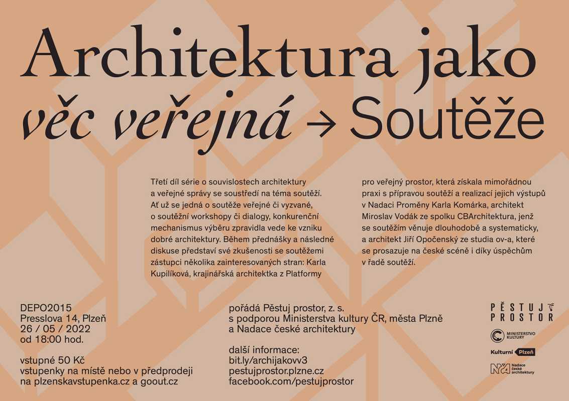 Jarní přednášková a diskusní série pořádaná plzeňským spolkem Pěstuj prostor postupně ukazuje kontexty a situace, v nichž se výkon profese architekta*architektky protíná se správou věcí veřejných. Třetí díl cyklu, zaměřený na architektonické soutěže, se uskuteční ve čtvrtek 26. května od 18 hodin v kulturní a kreativní zóně DEPO2015.