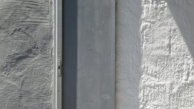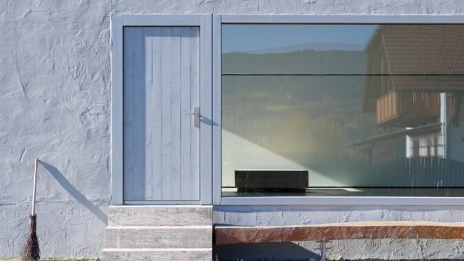 nahrubo omítnutou fasádu a velká dřevěná vrata.