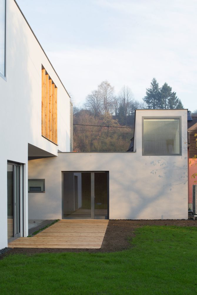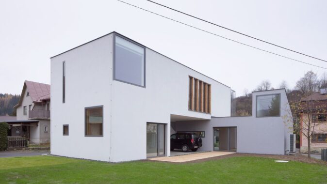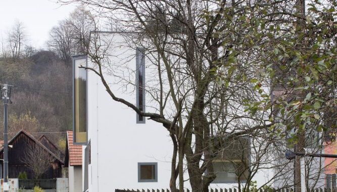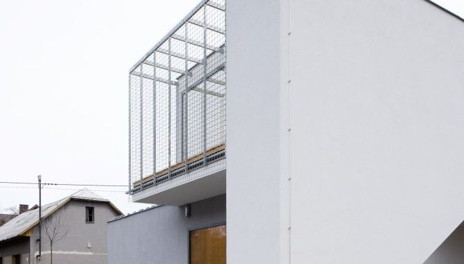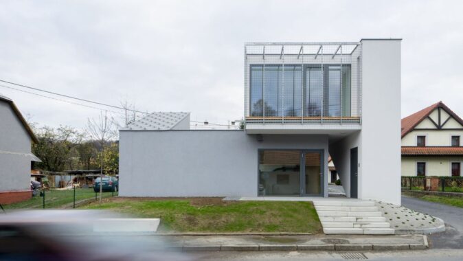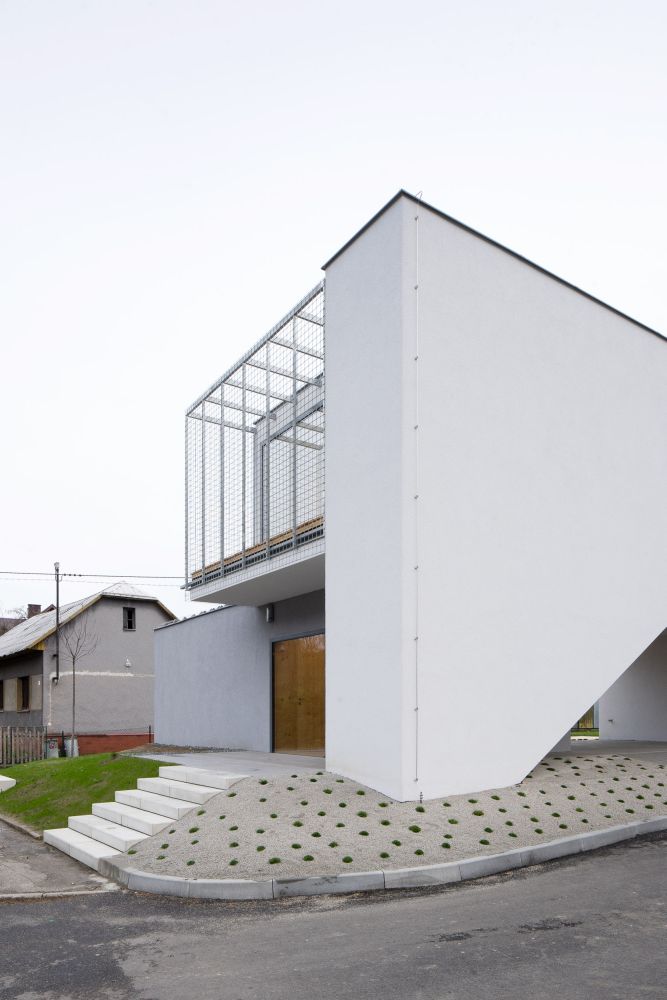Variabilita interiérů a vnější výraz domu reflektují jeho funkci. Celek tvoří menší objemy hmot, jejichž kompozice v přízemí vytváří dvě krytá parkovací stání. Pozemek není oplocen, přízemí je z části otevřeno do uliční fronty, z části se otevírá do intimní zahrady. Figura domu pracuje s rytmem, vrstevnatostí vztahů, střídá plno a prázdno. Hmota domu časem poroste vegetací a nahradí zelené koruny stromů.