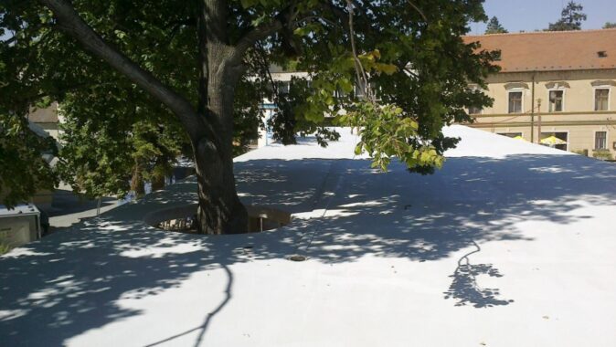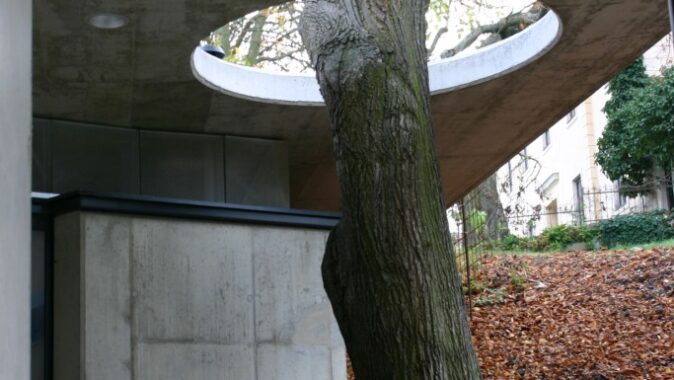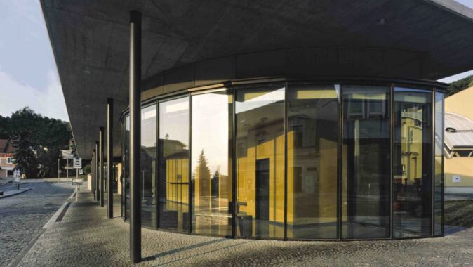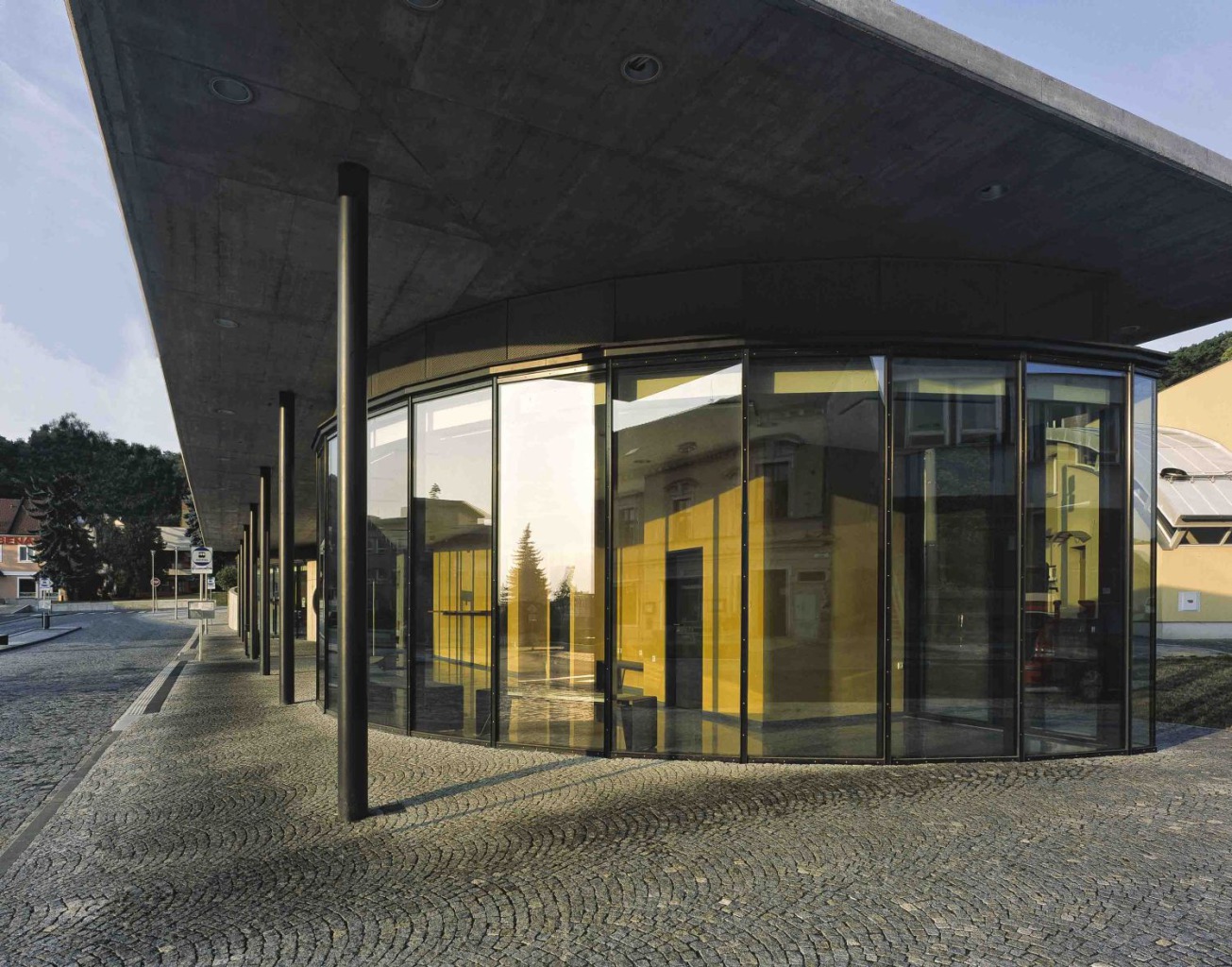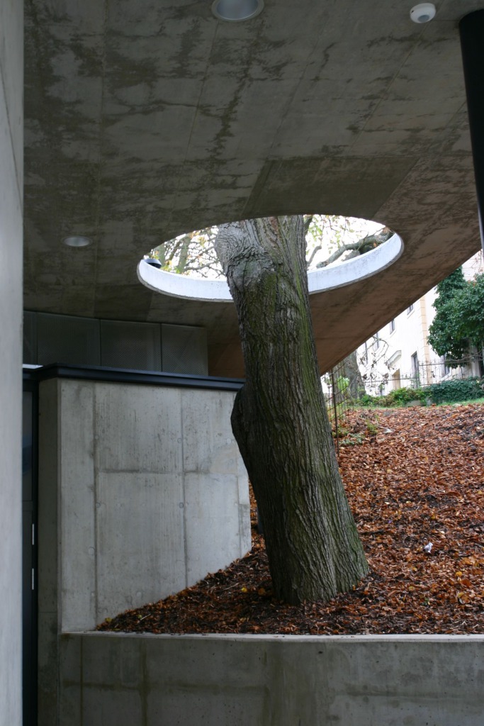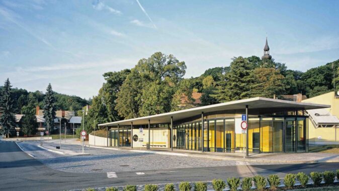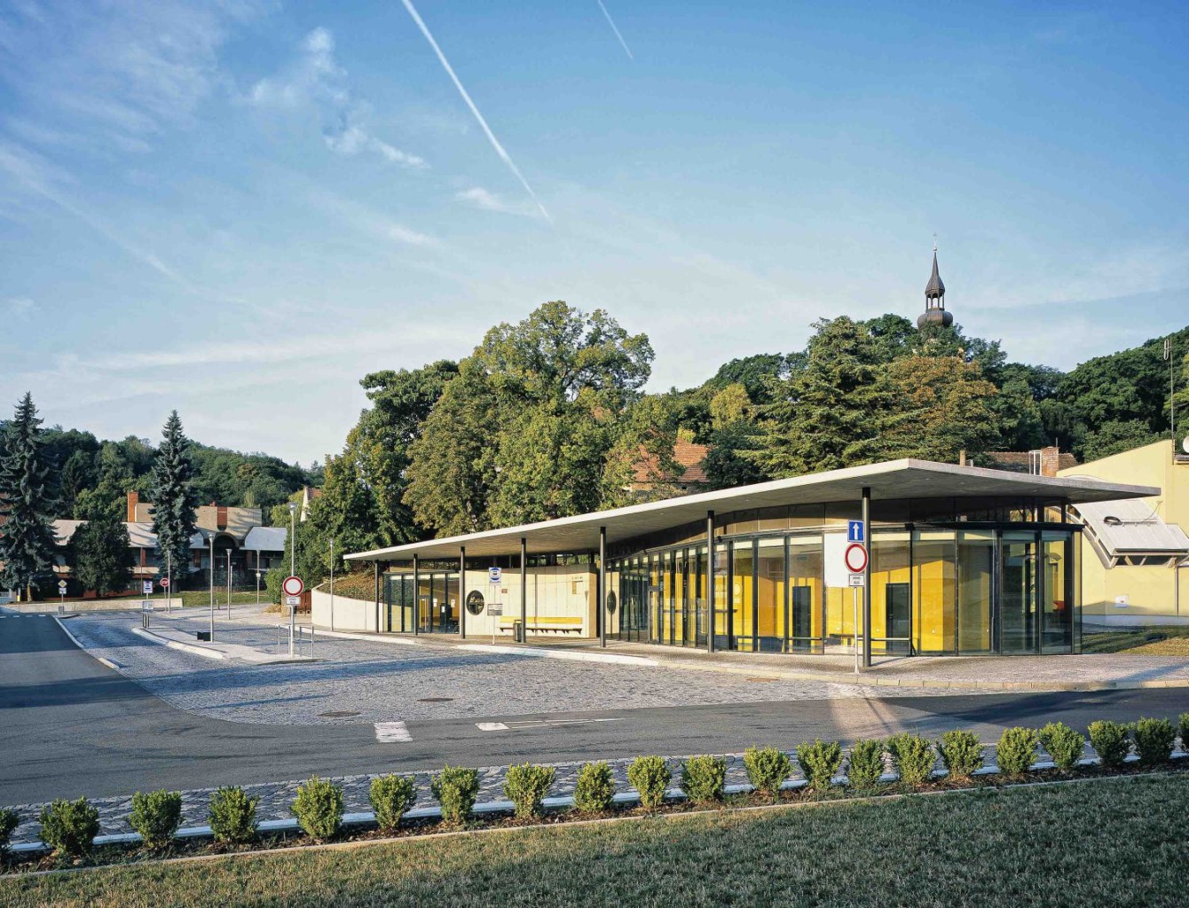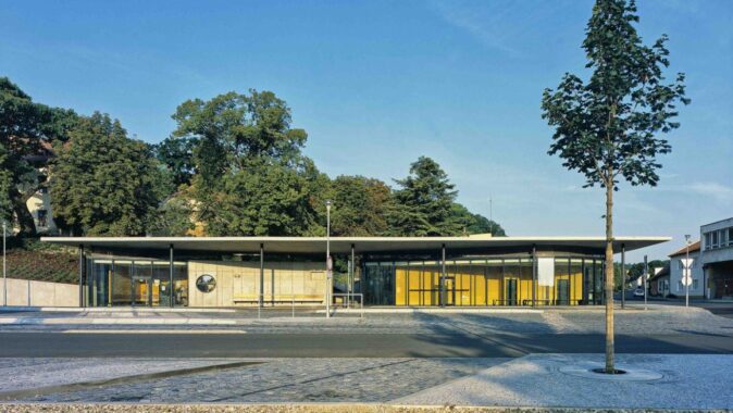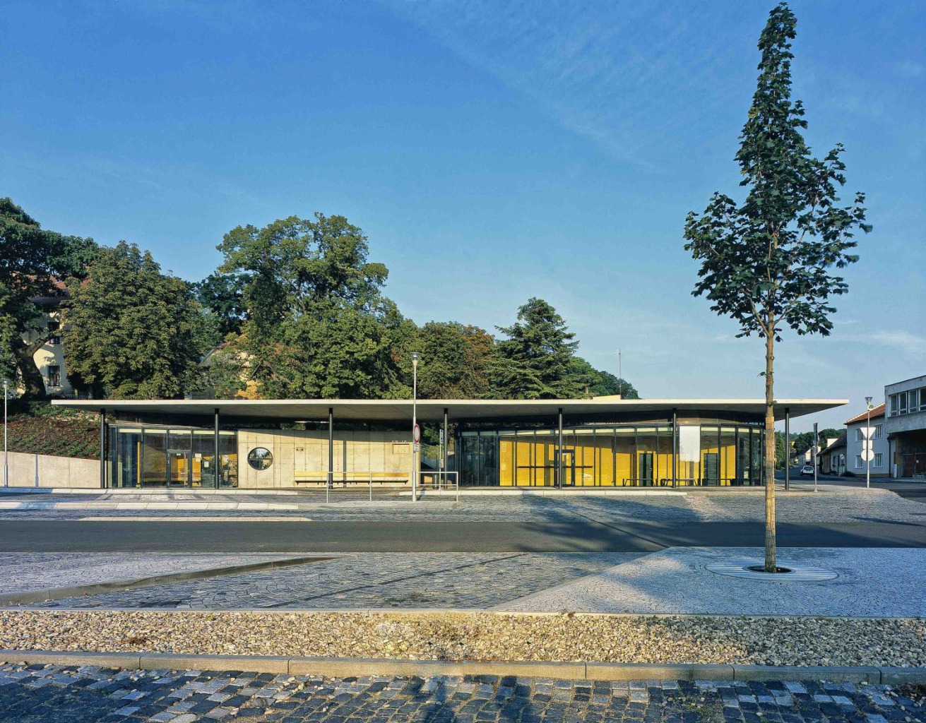 Horizontála nádraží leží pod zeleným svahem, střecha se vznáší nad halou a jako by z tohoto svahu vyrůstala. Kromě toho je v ní otvor pro vzrostlý strom, který se tak stal součástí budovy.