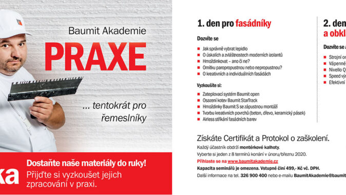 Baumit Akademie PRAXE – středy pro fasádníky• zájemci o realizaci fasády se dozví novinky v oboru a získají ucelené informace k tématu, využijí poradenství odborných školitelů společnosti Baumit s bohatou zkušeností ze stavební praxe• praktické ukázky se následně zaměří na aplikaci unikátního zateplovacího systému Baumit open, osazení lepicích kotev Baumit StarTrack, tvorbu kreativních povrchů či stříkání fasádních barev metodou Airless