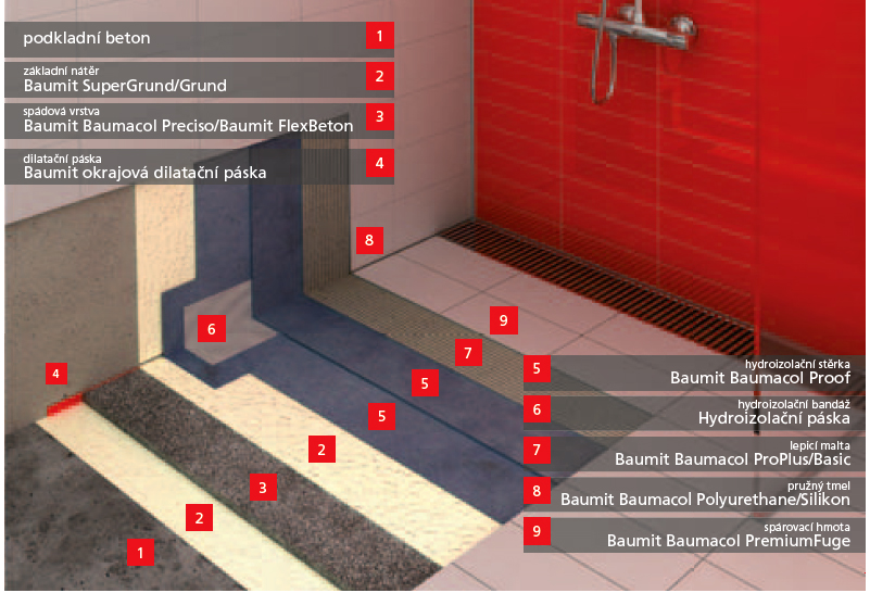 Hydroizolační hmoty Baumit Baumacol jsou povlakové hydroizolace, které chrání podkladní vrstvy podlahové nebo stěnové skladby před účinky vody a vlhkosti. Jejich použití je nezbytné v místnostech s odstřikující vodou nebo zvýšenou vlhkostí, jako jsou koupelny, kuchyně, technické místnosti, bazénové prostory apod. Precizní aplikaci hydroizolačních hmot zajišťuje použití systémového příslušenství, které utěsní těžko zapravitelné spoje, např. spoj stěna/podlaha, nebo vytvoří bezchybný přechod u vpustí, výtoků a prostupujících instalací. Použití hydroizolačních opatření je dnes nezbytnou součástí konstrukcí v exteriéru, jako jsou např. balkóny, lodžie a terasy.