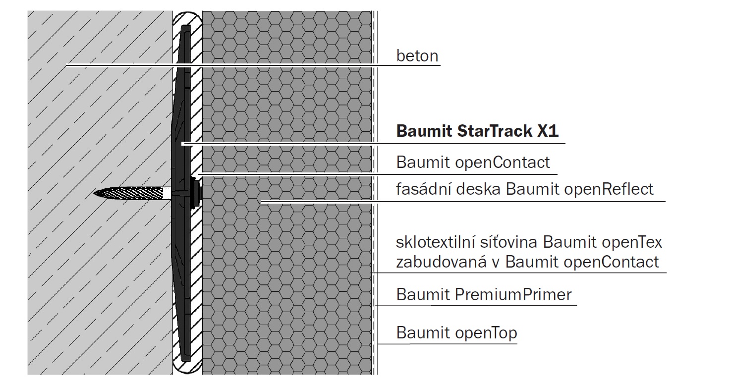 Lepicí kotva Baumit StarTrack X1, která je součástí již zmíněného zateplovacího systému Baumit open a Baumit Star EPS, je určena především k aplikaci certifikovaných izolačních desek Baumit openReflect, respektive Baumit StarTherm na železobetonové podklady novostaveb. Konstrukce této nové kotvy se však opírá o více než 15leté zkušenosti Baumitu z oblasti lepení izolantu k různým typům konstrukcí. Lepicí kotva Baumit StarTrack byla totiž vytvořena v roce 2005 jako alternativa k běžnému osazování pomocí hmoždinek a provrtávání izolačních desek na fasádě.