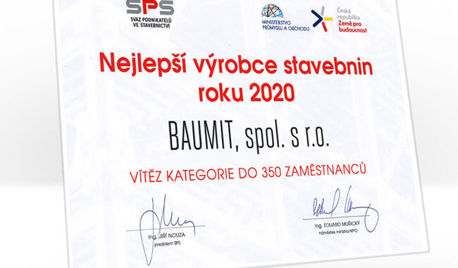 Společnost Baumit získala vítězné ocenění Nejlepší výrobce stavebnin roku 2020 v kategorii do 350 zaměstnanců.