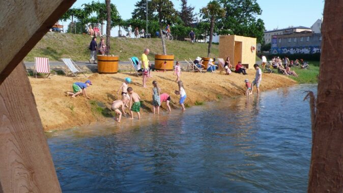 kde si hrají rodiny s dětmi a dřevěné schodiště na protějším břehu nabízí nový