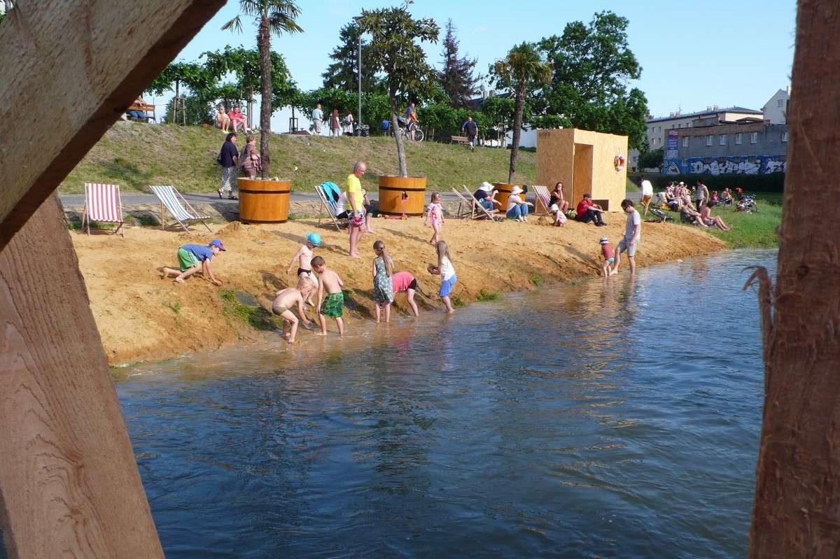 kde si hrají rodiny s dětmi a dřevěné schodiště na protějším břehu nabízí nový
