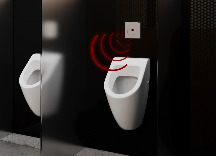 I u této varianty se spouští splachování bezkontaktně a hygienicky, a to díky infračervenému senzoru v ovládací desce umístěné na zdi nad pisoárem. Impulsem pro spláchnutí je situace, kdy se osoba zdržuje minimálně osm sekund v oblasti snímání infračerveného senzoru. Snímací oblast, množství splachovací vody a četnost splachování lze variabilně nastavit podle očekávaného použití a individuálních požadavků.