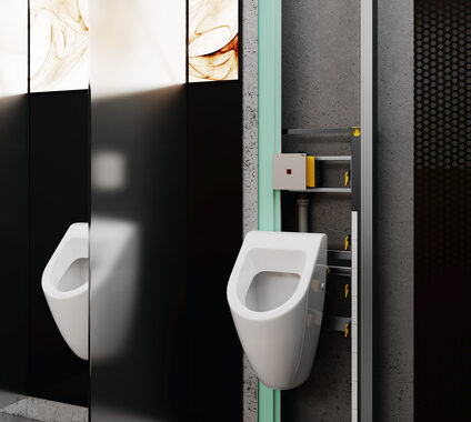 Systém skrytého spouštění splachování je k dispozici jako vybavovací sada k podomítkovým pisoárovým prvkům Viega Prevista Dry.