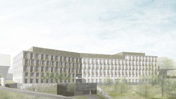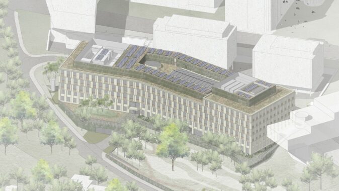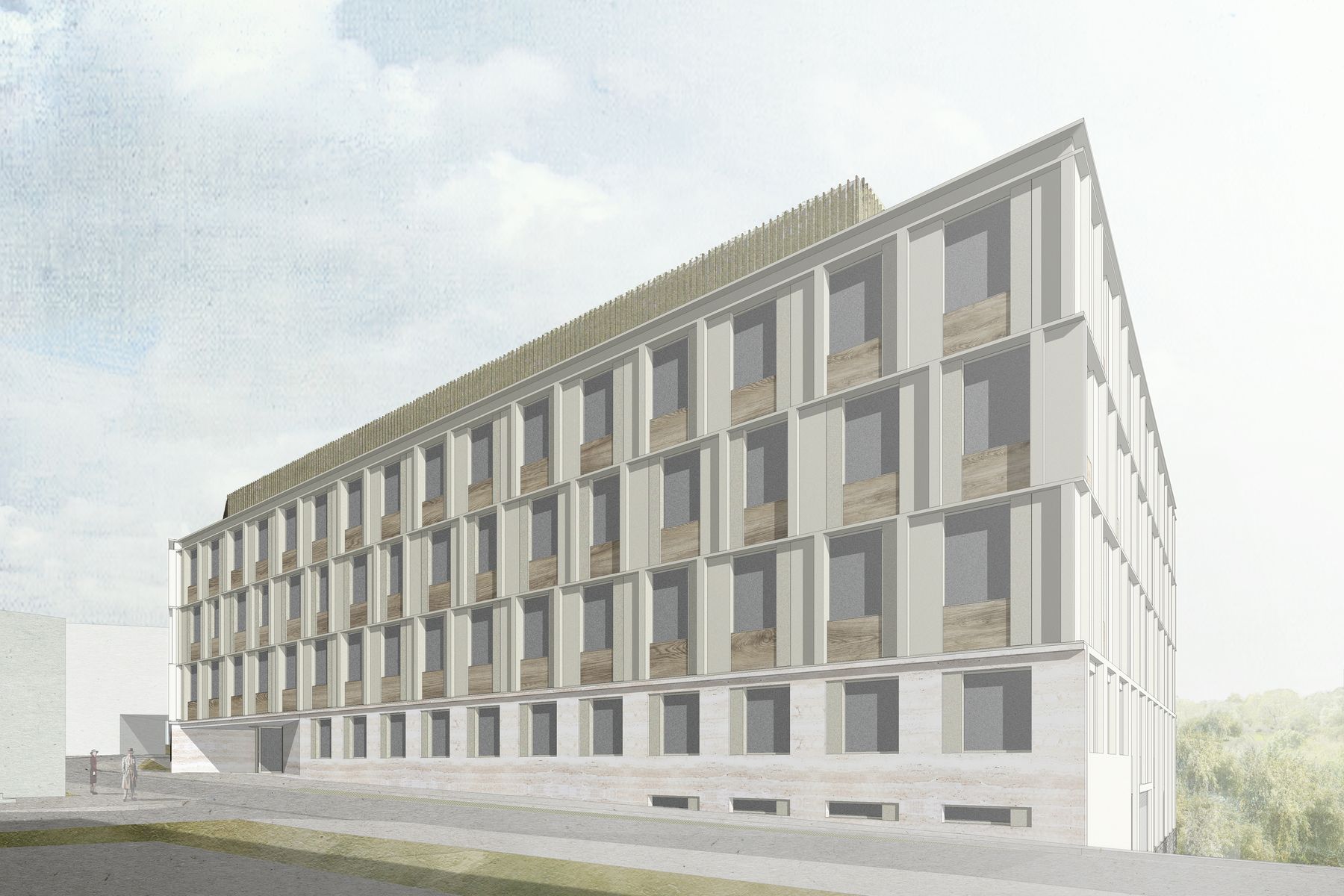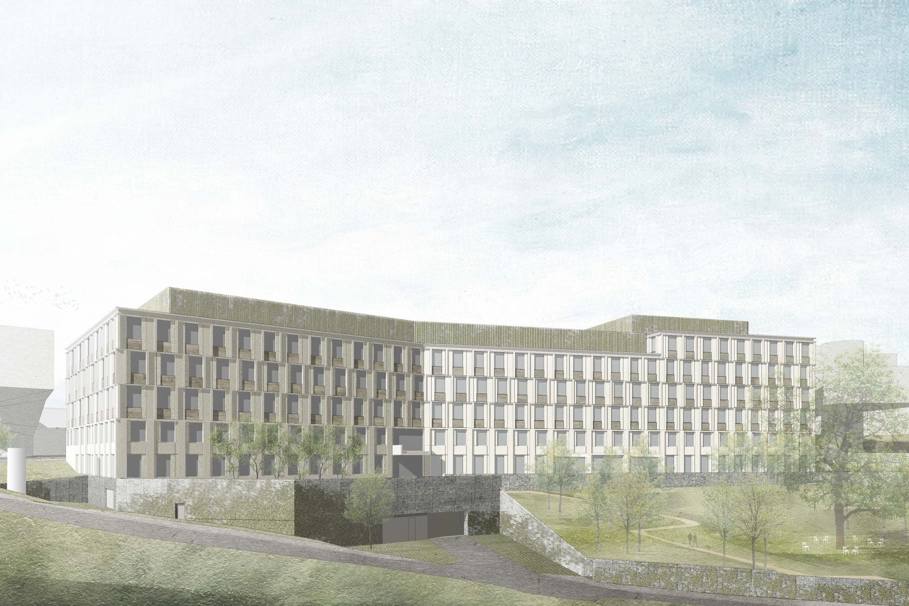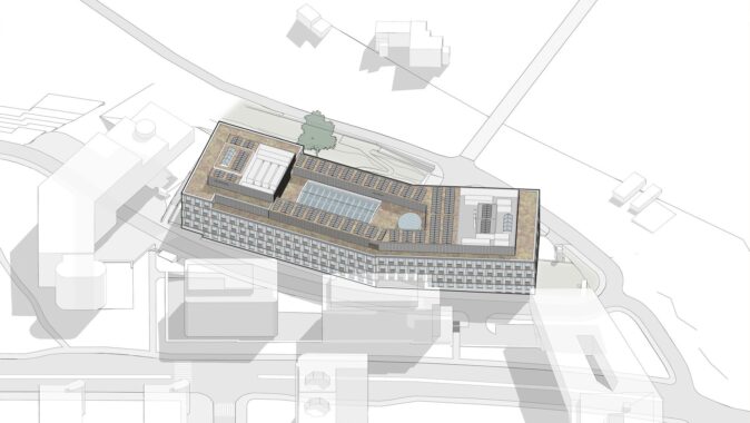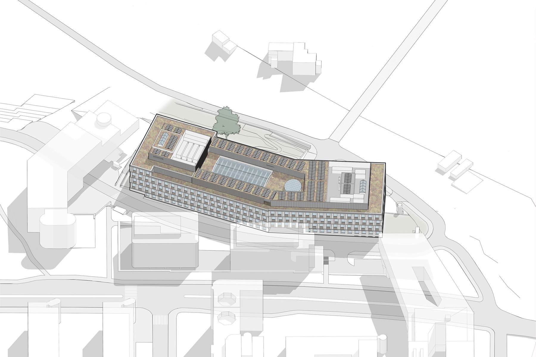 Velikost a tvar stavebního pozemku je jednou z výzev, se kterou se návrh musel vyrovnat. Zatímco podobné laboratorní stavby se obvykle stavějí na rovinném terénu pravidelného tvaru, zde má staveniště tvar velmi nepravidelný. Blíží se ostroúhlému trojúhelníku, do nějž se zařezává obdélníková, dle ÚPmB nezastavitelná plocha krajinné zeleně a jeho ramena jsou ve spádu. Přitom to severní je ve svažitém terénu na dně žlebu umístěno o přibližně 15 m níže než jižní, ležící na vrstevnici Studentské ulice (která ovšem ve skutečnosti nemá charakter ulice, nýbrž jakéhosi lineárního zásobovacího dvora). Z této ulice, která je ve svahu zaříznuta o výšku podlaží níže než paralelní ulice Kamenice, se do budovy vstupuje. Avšak z hlavní komunikace Kampusu, ulice Kamenice, kterou je vedena rovněž MHD, není k navrhovanému objektu Biopharma Hubu přístup. Ten teprve projekt vytváří navrženými průchody v prolukách její severní fronty mezi objekty stomatologické kliniky a SIMU, resp. Biology Parku.