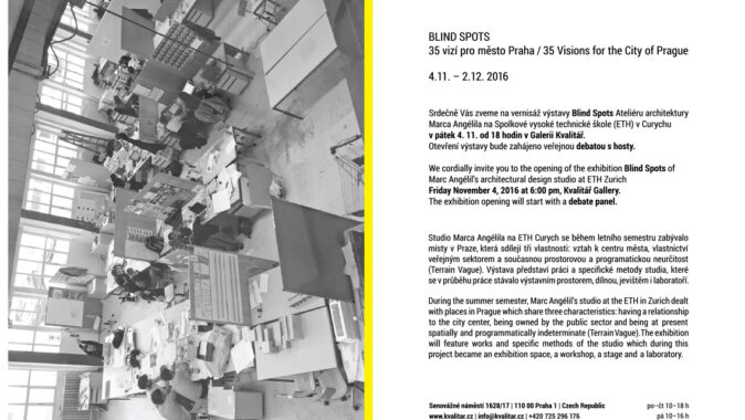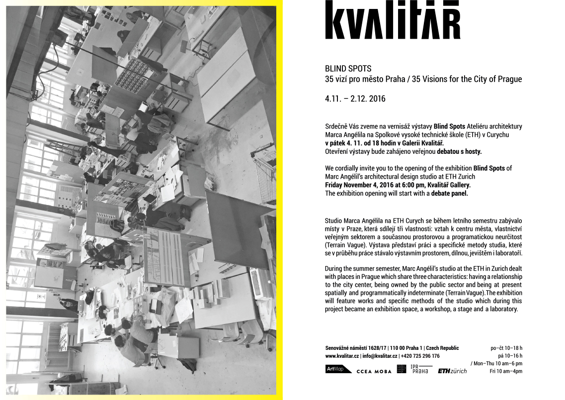 V galerii Kvalitář se představí curyšská škola architektury, kde tématem posledního semestru byly vize několika pražských lokalit. Studio Marca Angélila na ETH se zabývalo místy se třemi chrakteristikami: vztah k centru města, vlastnictví veřejným sektorem a současná prostorová a programová neurčitost (tzv. „Terrain Vague“). Výstava představí práci a specifické metody