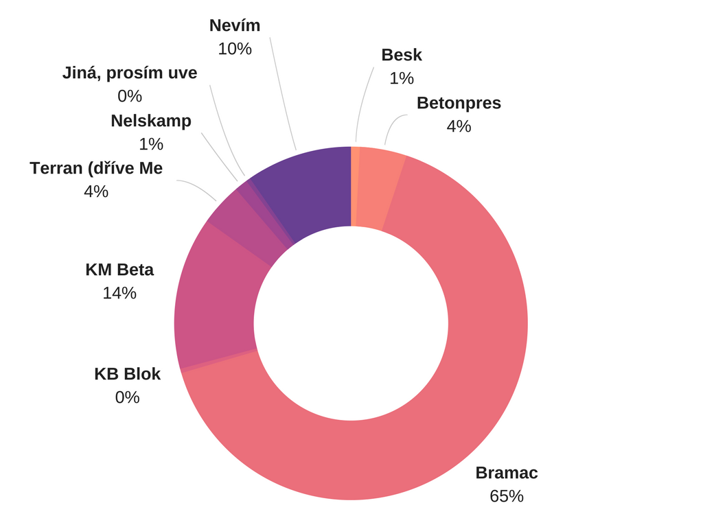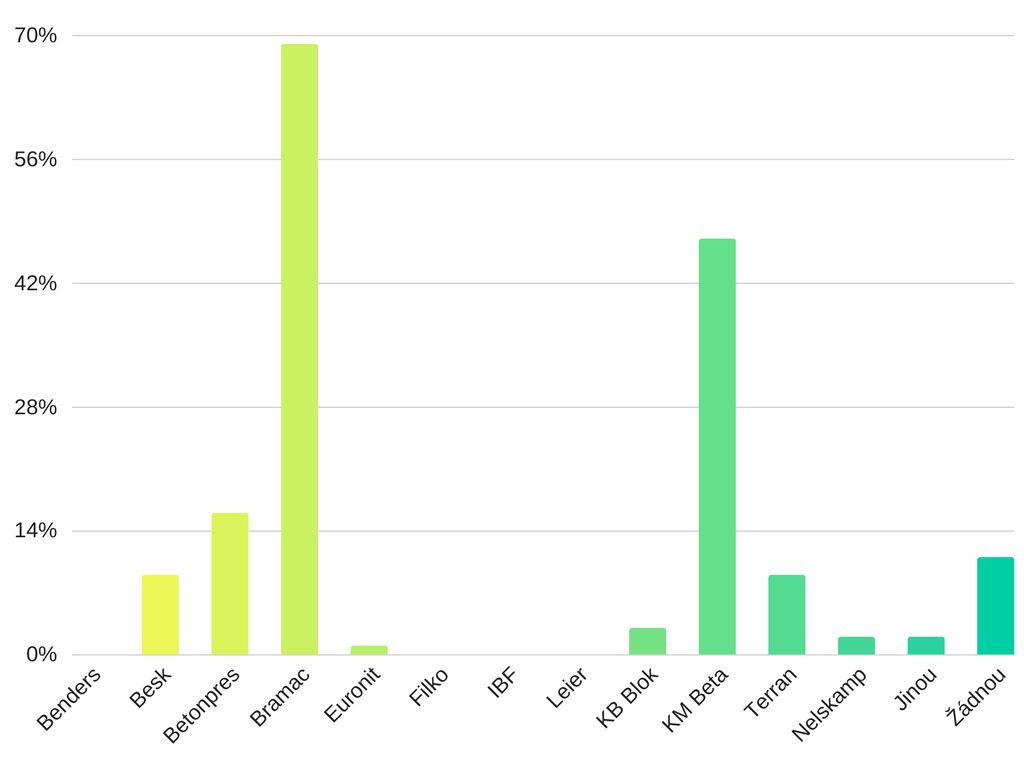 A jak profesionálové hlasovali o nejlepší značce v kategorii Betonové tašky? Ve prospěch Bramacu hlasovalo celkem 65 % respondentů. Ostatní výrobci skončili za Bramacem s výrazným odstupem, neboť pro KM Betu hlasovalo 14 % respondentů a značky Terran a Betonpres 4 %.
