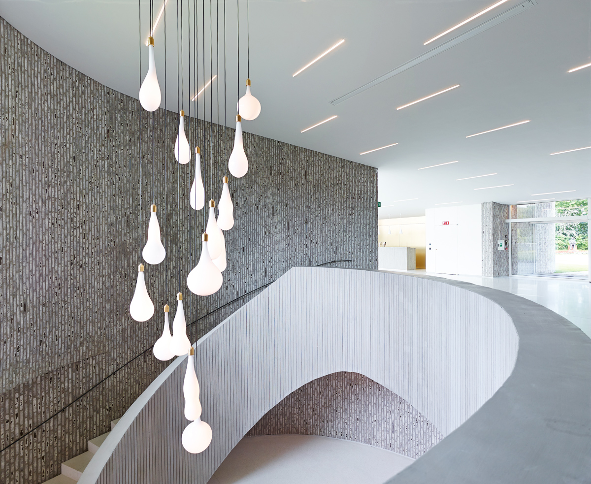 Soubor tradičně pravoúhlých školských budov architekti doplnili přednáškovou síní na organickém půdorysu. Obvodový plášť i část interiéru jsou obloženy na svislo kladenými cihlami, které se dokonale přizpůsobují zakřivenému tvaru a umožňují perfektní a originální zpracování každého detailu. Například vjezdová vrata kompletně obložená cihlami se ve fasádě budovy stala takřka neviditelnými.