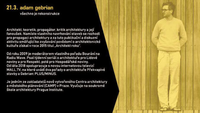Architekt a teoretik Adam Gebrian (*1979, Boskovice, CZ) se namísto vlastního navrhování staveb rozhodl pro propagaci architektury. Za tuto publikační a diskuzní aktivitu směřující ke zvyšování povědomí o architektonické kultuře získal v roce 2015 titul „Architekt roku“.