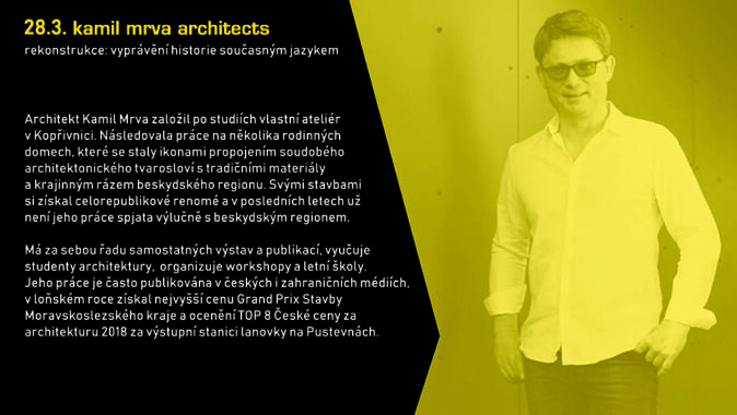 Kamil Mrva má za sebou řadu samostatných výstav a publikací, vyučuje studenty architektur, organizuje workshopy a letní školy architektury. Jeho práce je často publikována v českých i zahraničních médiích, v loňském roce získal nejvyšší cenu Grand Prix Stavby Moravskoslezského kraje a ocenění TOP 8 České ceny za architekturu 2018 za výstupní stanici lanovky na Pustevnách.
