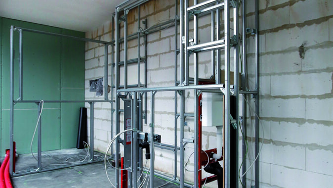nosná konstrukce pro upevnění umyvadla a toalety. Tento systém umožňuje