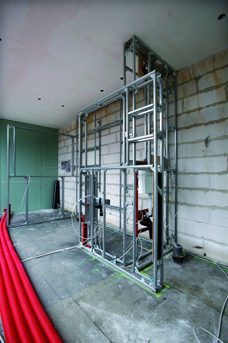 nosná konstrukce pro upevnění umyvadla a toalety. Tento systém umožňuje