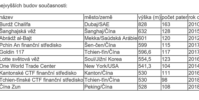 V žebříčku deseti nejvyšších staveb světa se za posledních pět let vyměnila polovina, čtyři mrakodrapy byly postaveny v Číně a jeden v Jižní Koreji. Třeba mrakodrap Tchaj-pej 101 je nyní na 11. místě, věže Petronas na 19. místě a Empire State Building se krčí na 49. místě.