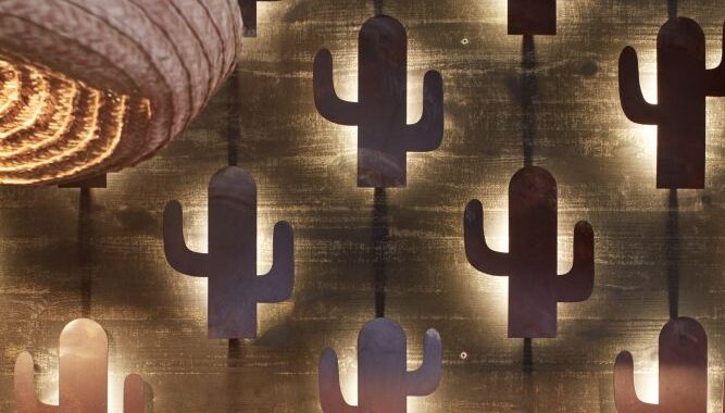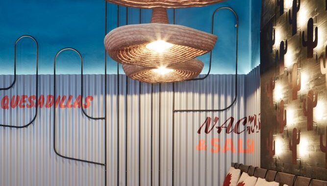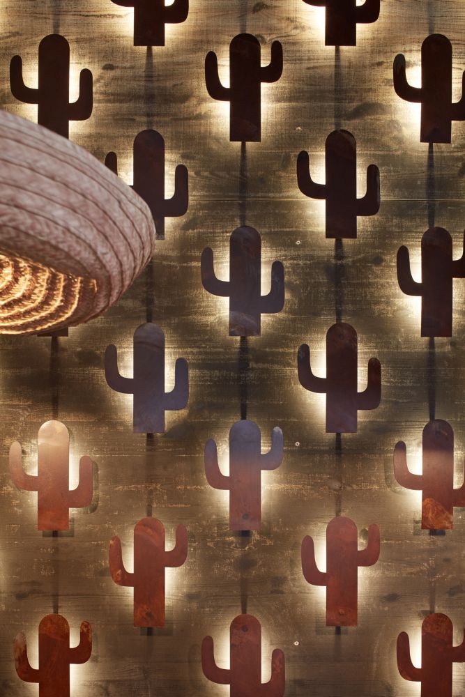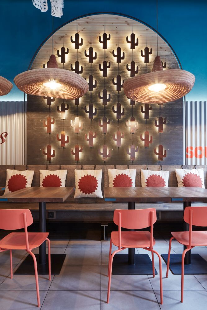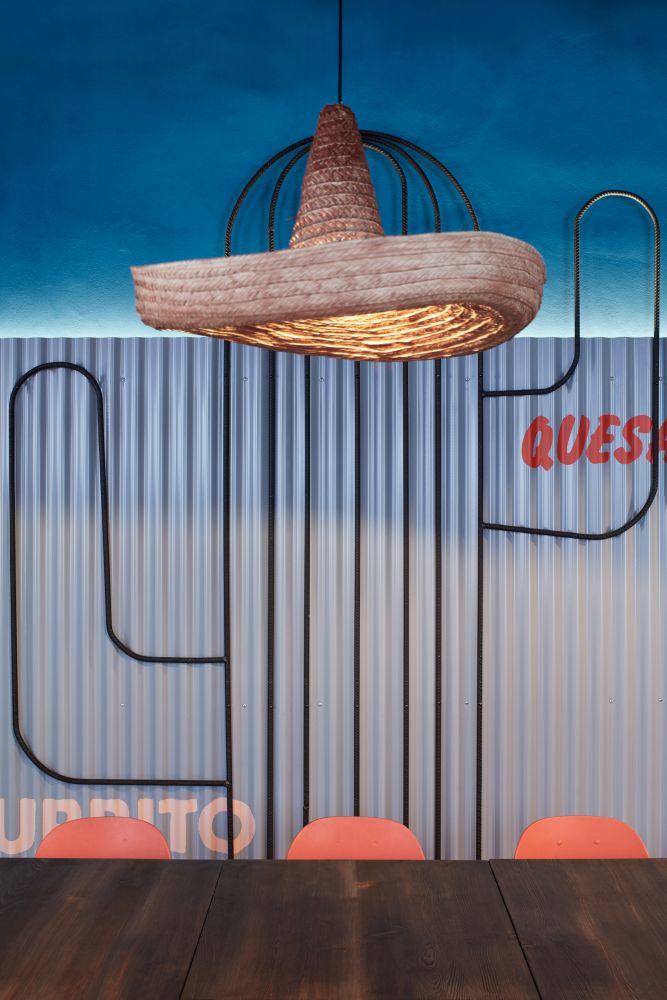 Mexiko je plné barev. Charakteristickým znakem je pestrost a nazdobenost. V návrzích jednotlivých poboček zachováváme stále stejné materiály a stejné prvky, pro každou provozovnu jsme však volili jiné barevné kombinace. Barevnost se s každou pobočkou mění na obkladech z vlnitého plechu, výmalbách, keramických dlaždičkách a také na židlích. Charakteristické mexické dlaždičky jsme záměrně nahradili jednobarevnými a do interiéru jsme dotek Mexika dostali skrz některé symboly, které jsou pro Mexiko typické. Zásadním z prvků je symbol kaktusu, který je v interiéru dominantní a stylizovaný v různých formách. Dalšími prvky jsou sombrera a girlandy. Z typicky mexických velkých klobouků byla vyrobena závěsná svítidla. Girlandy nechybí na žádné mexické party, jsou zavěšené na stromech u každého plechového stánku s občerstvením. V interiéru Burrito Loco jsou nakombinované girlandy z malých žárovek a girlandy ozdobné s vystřihovaným vzorem. Sombrera, stejně tak jako bílé plastové ozdobné girlandy se objednávaly v Mexiku.