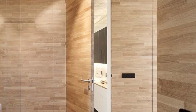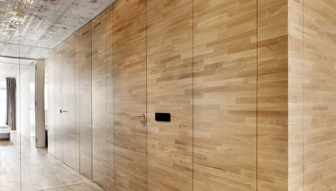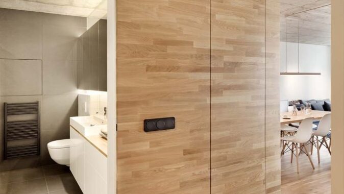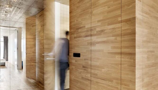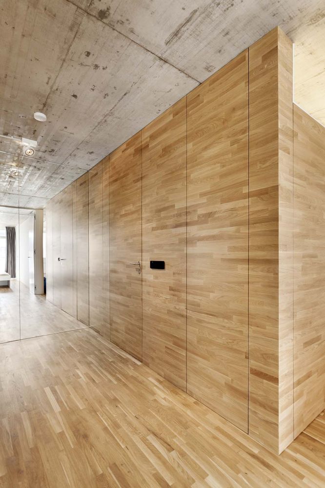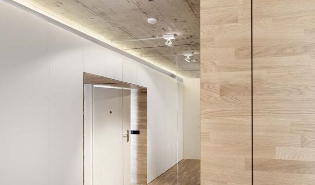vestavěnými skříněmi. Hlavním záměrem bylo pocitově propojit celý byt to