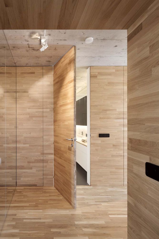 materiál i formát dubových lamel, celý prostor je tak materiálově maximálně