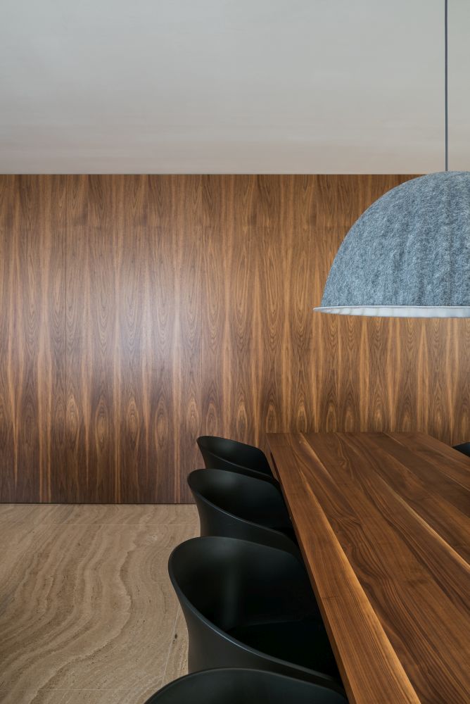 základních prvků: bílá barva, ořechová dýha a travertin.