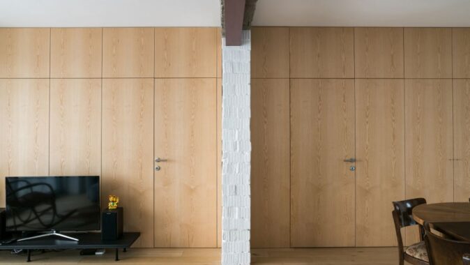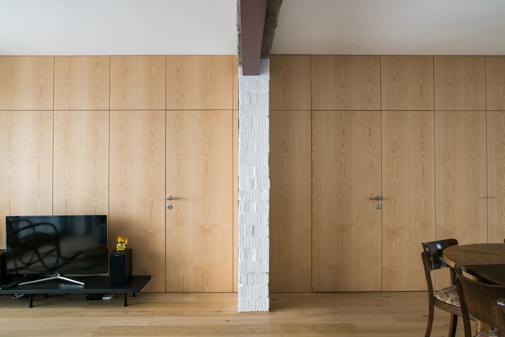 prostor jsme předělili vestavěnou dřevěnou skříní, v níž se nachází