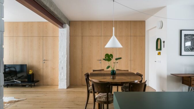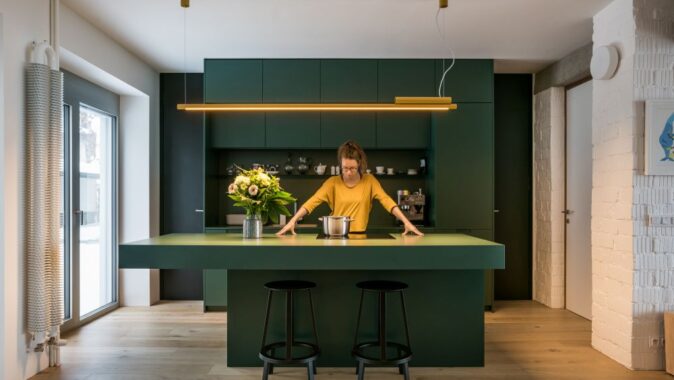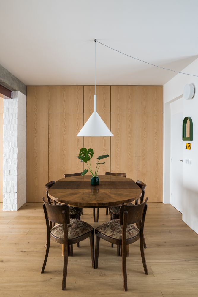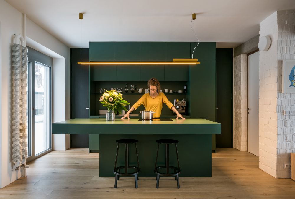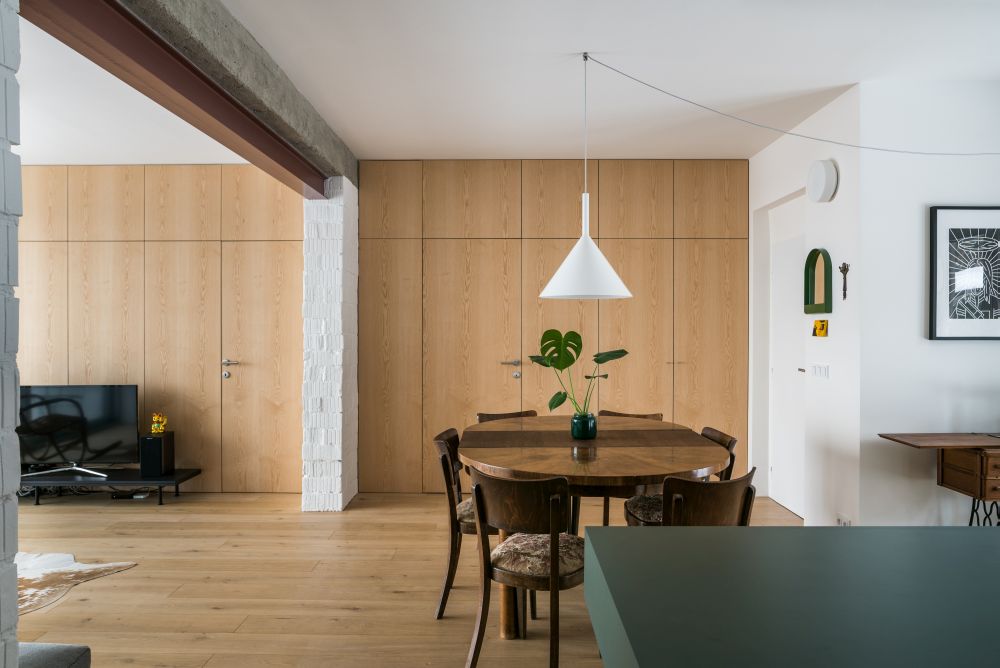 Barevnost jsme založili na poctivých materiálech základních prvků: stěny jsou bílé, podlahy dubové, u vestavěné skříně jsme zvolili dýhu z jasanu, kuchyňská linka je zelená.