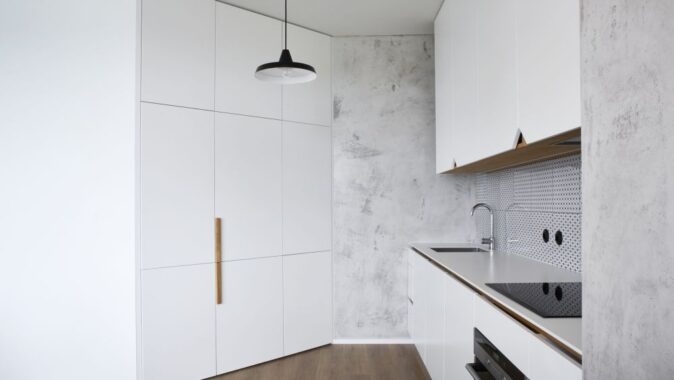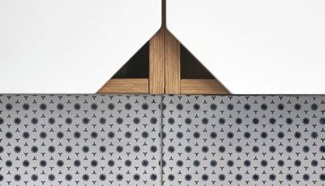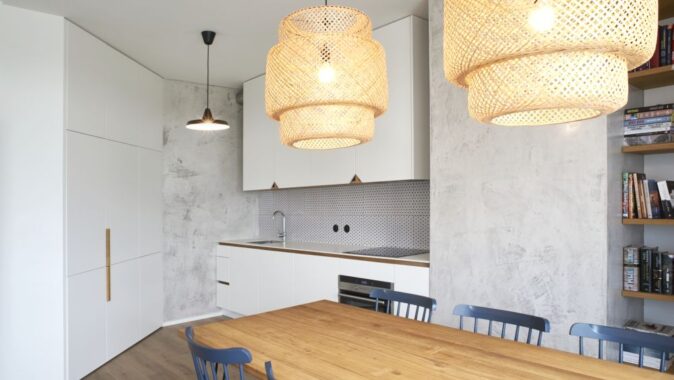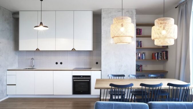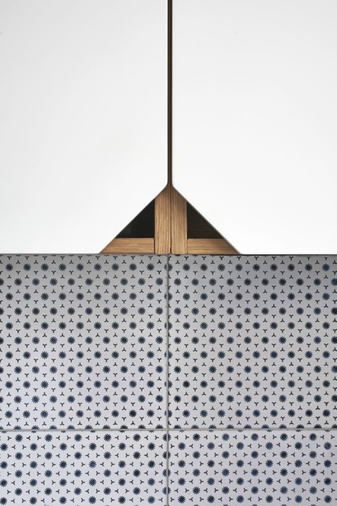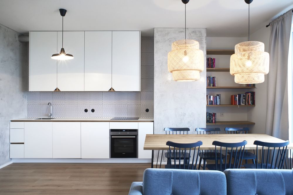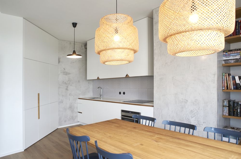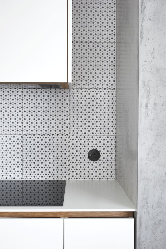 Obývací pokoj s kuchyní: Barevná paleta se skládá z kombinace bílé a petrolejové barvy, doplňují ji dub, černé akcenty a šedá barva v podobě betonu. Výrazným prvkem jsou ručně vyráběné italské obklady na kuchyňské zástěně. Ty společně s nevšedním řešením úchytek v podobě seříznutých rohů dávají celku potřebný detail. Vestavná lednice je umístěna v rohu v trojúhelníkové sestavě. Ta efektně využívá roh a přitom jej neuzavírá. Na stěny v kuchyňské části byla nanesena stěrka s imitací betonu. Stůl je z dubové desky s kovovou podnoží. Židle a sestava v obývací části barevně navazují na obklady. Sestava je navíc profrézovaná pro narušení jednoduché hmoty. Sedací souprava je v šedé látce a konferenční stolky jsou černé. Od podlahy je odděluje výrazně vzorovaný koberec.