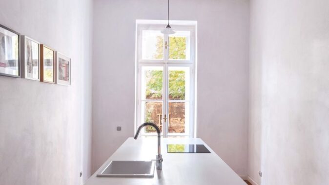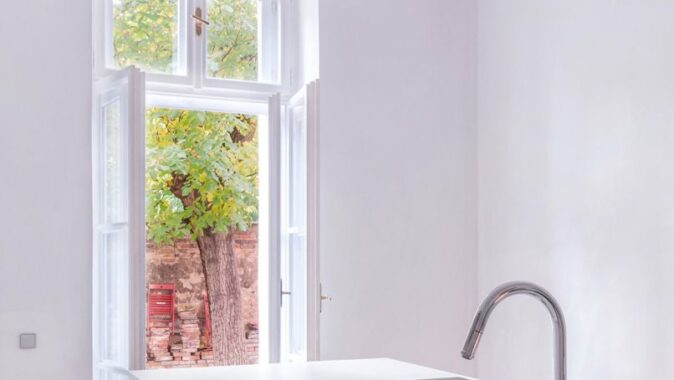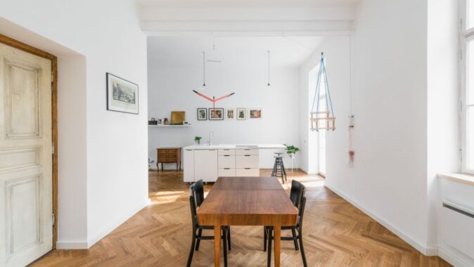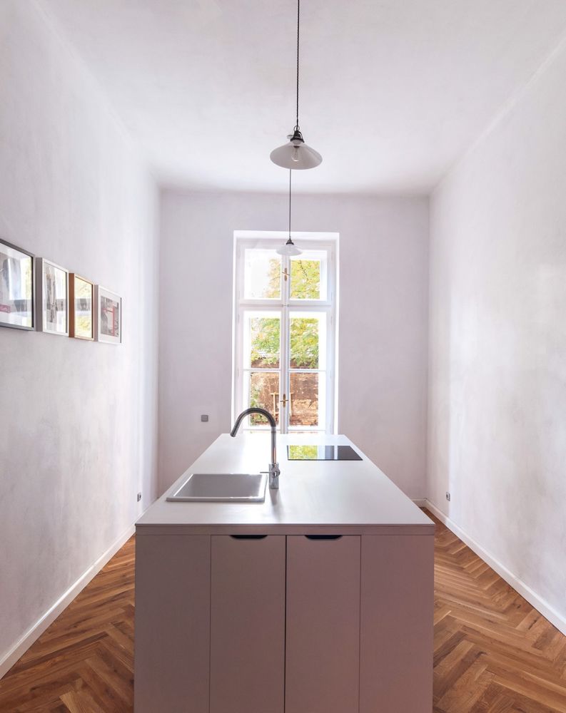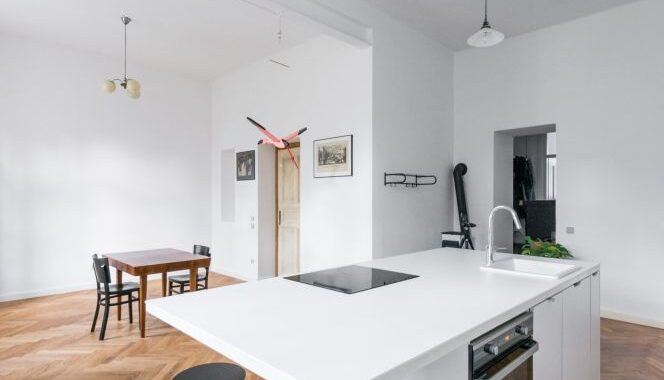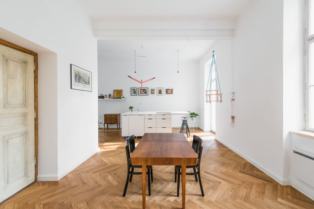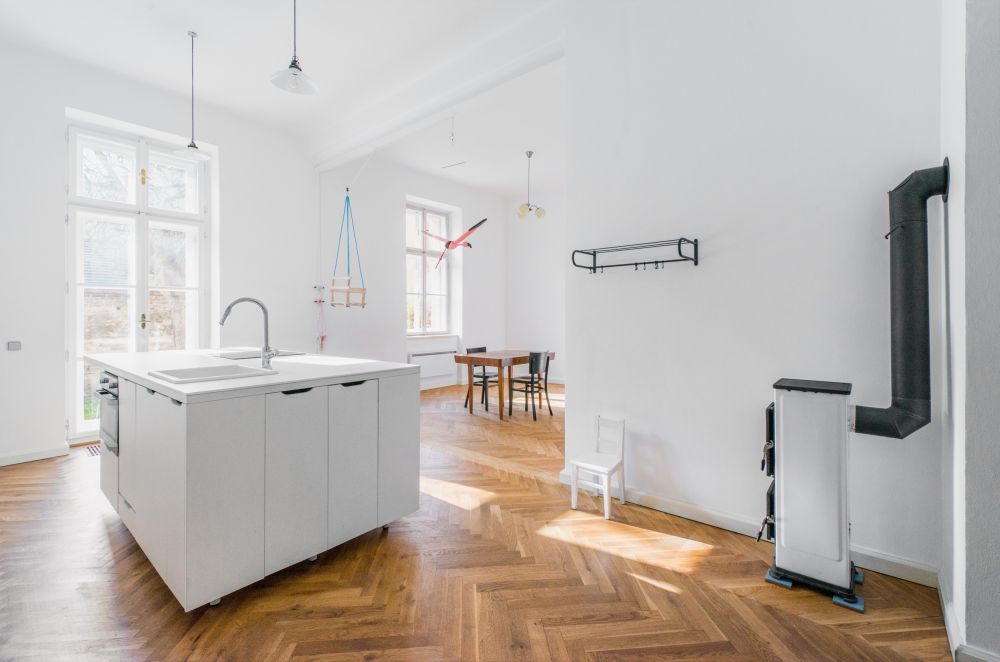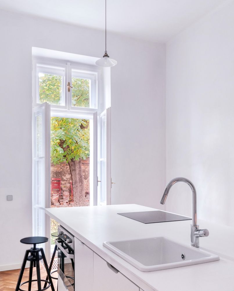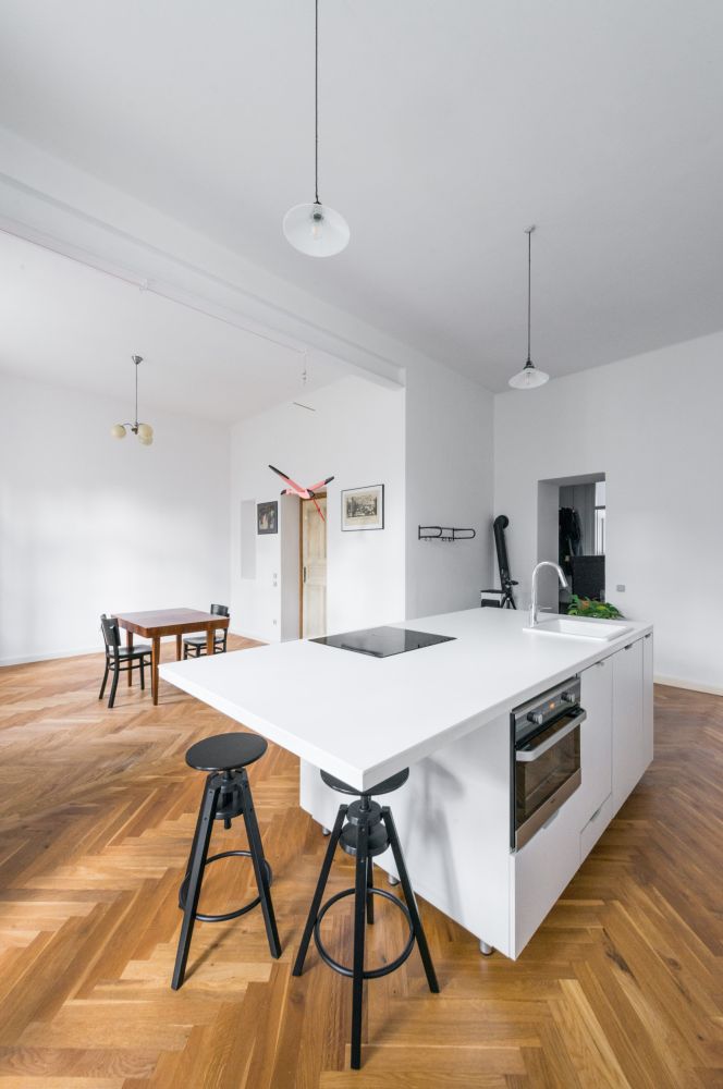 V našem návrhu jsme se snažili obrátit nevýhody bytu ve výhody. Poloha v prvním nadzemním podlaží si přímo říkala o francouzské okno, které propojí obytnou kuchyň a zahradu ve dvoře. Díky možnosti vést odpadní potrubí ve sklepě nebylo složité vybudovat novou koupelnu a WC. Vlhkost v bytě reguluje topení v kamnech, která bylo možné připojit do původního komínového průduchu. Kuchyně je řešena jako obytná se skromným místem pro natažení nohou u kamen, což ušetřilo prostor pro dvě samostatné ložnice. Díky tomu je možné byt využívat flexibilně v průběhu času (vlastní bydlení, spolubydlení, podnájem). Původní řešení bytu z roku 2010 předjímalo možnost připojení sousední garsonky, ke kterému došlo v roce 2016. Vznikl tak velkorysý obytný prostor tvaru L a nový prostor předsíně.