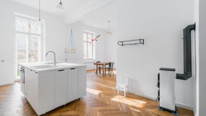 Byt v činžovním domě z roku 1893 vznikl spojením dvou menších, původně dělnických bytů v druhé polovině minulého století. Ze stejné doby byl i sprchový kout a umyvadlo v kuchyni. WC bylo na chodbě. Sousední domovnický byt s jednou místností o ploše 16 m2 nebyl pronajatý s možností budoucího připojení.