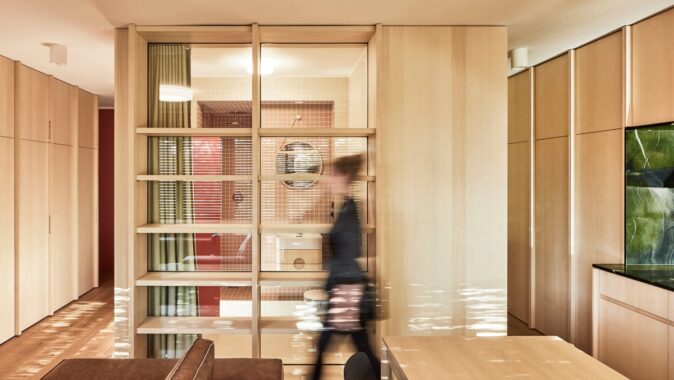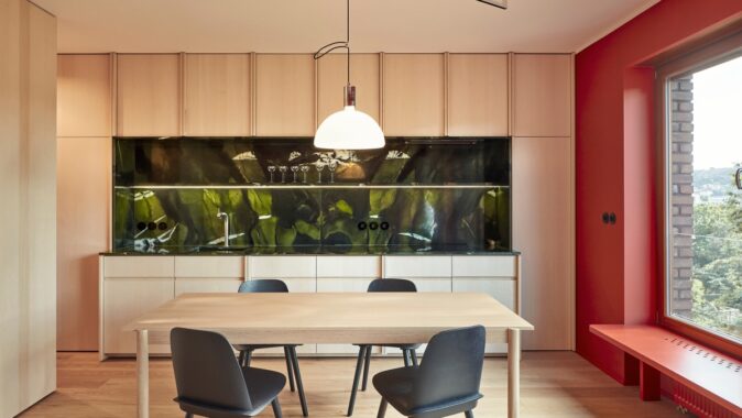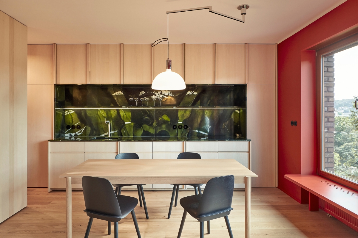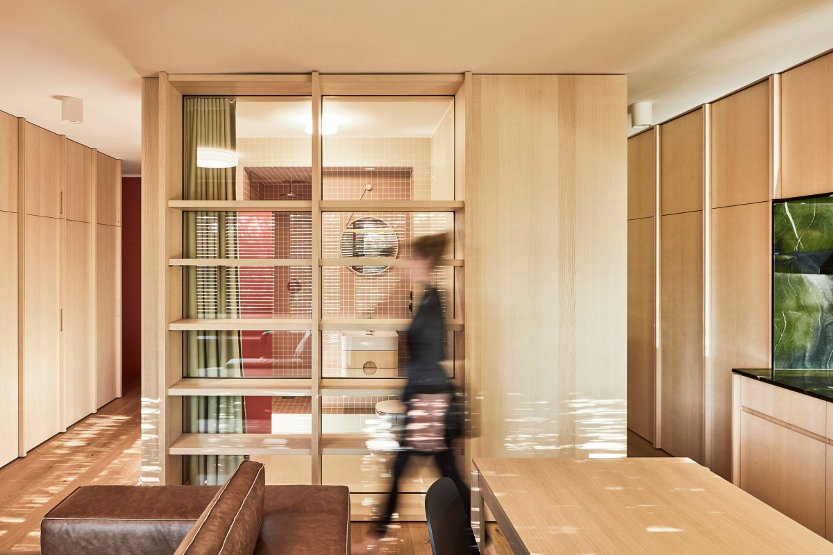 Zadáním projektu byla komplexní rekonstrukce interiéru bytu pod pražským Vyšehradem. Využili jsme příležitosti a vytvořili novou, efektivnější dispozici. Pomocí prosklených policových stěn jsme prosvětlili koupelny v centrální části bytu.