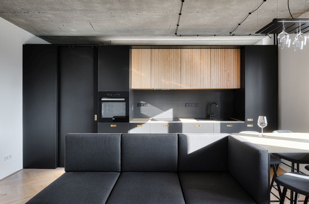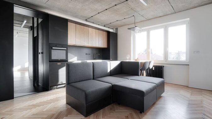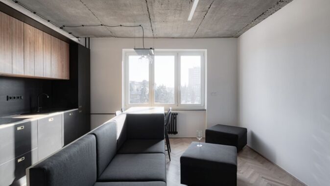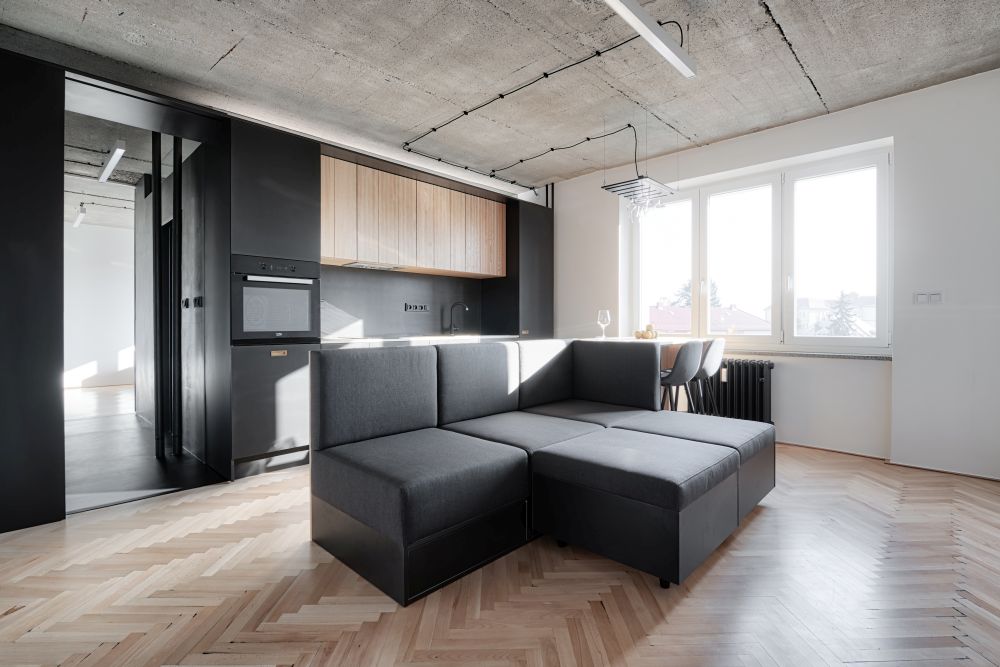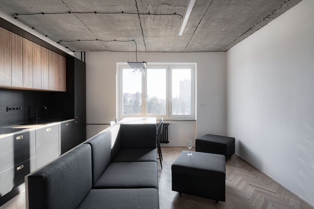 Malý dvoupokojový byt v blízkosti frekventovaného okruhu kolem centra Olomouce, přesto s klidným výhledem do zeleně, je součástí šestipatrového panelového bytového domu ze šedesátých let. Orientován je na jižní fasádu a má jednoduché půdorysné členění na dva obytné pokoje, mezi které je vsazeno hygienické jádro.