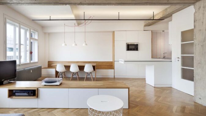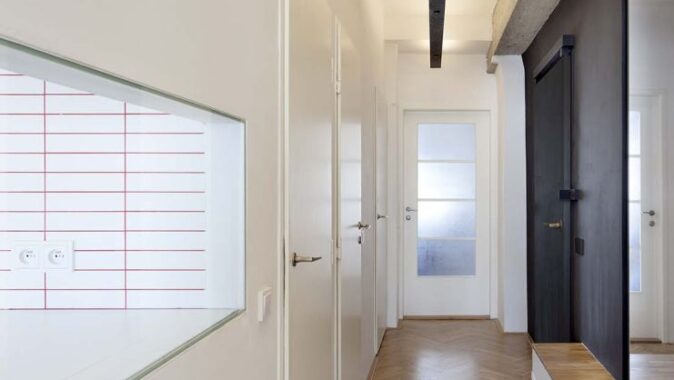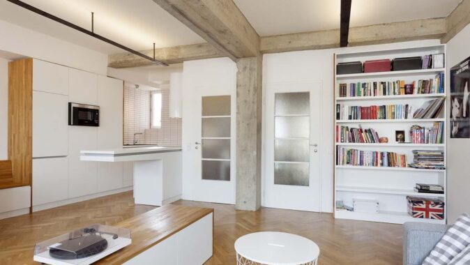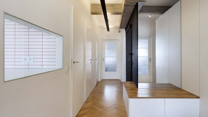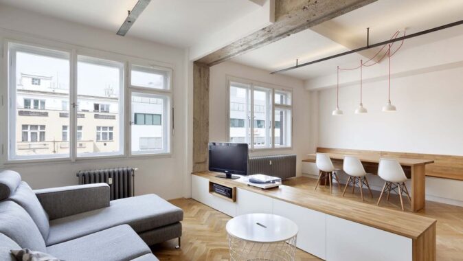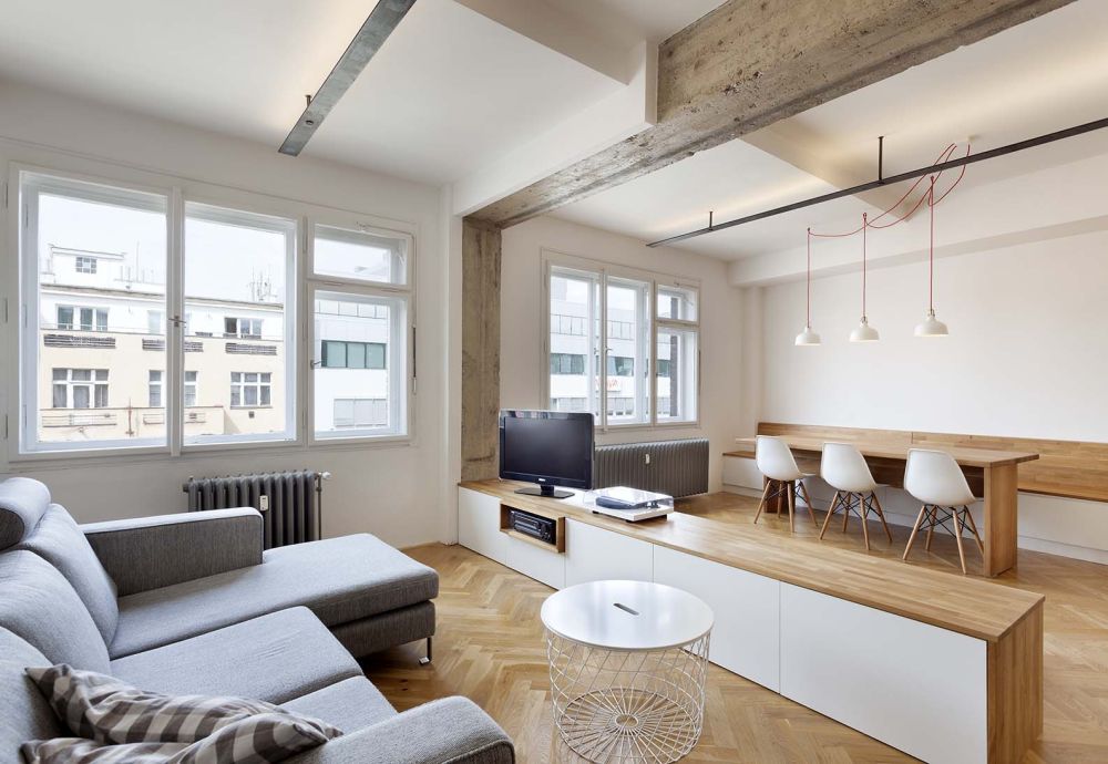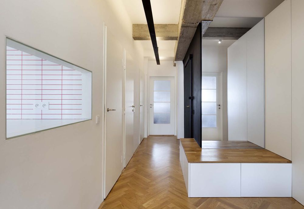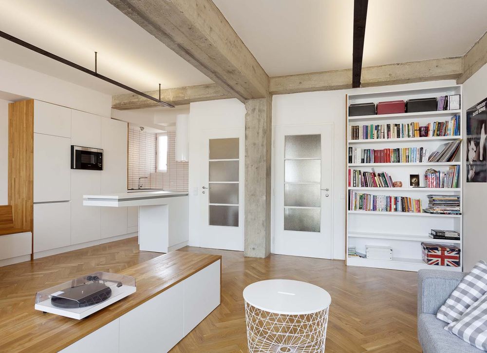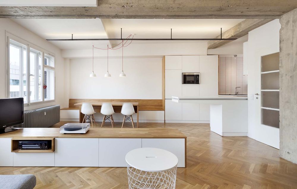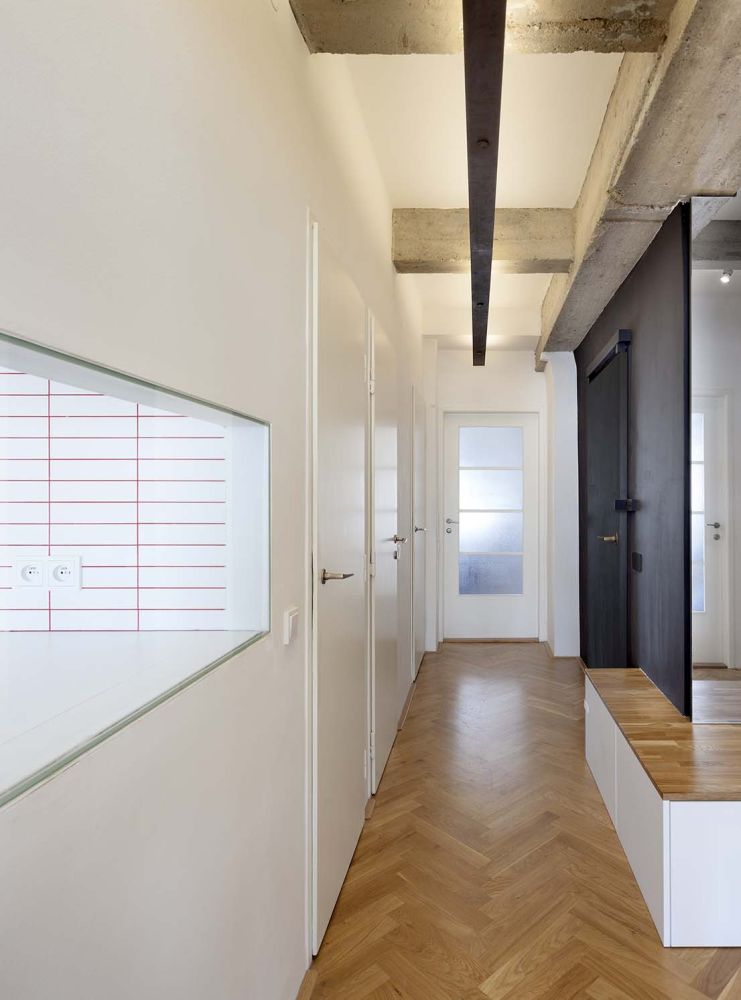 Byt ze třicátých let minulého století byl na první pohled zajímavý svým konstrukčním řešením, které se výrazně promítalo do tvaru jednotlivých místností už v původním stavu. Po provedení sond se potvrdila domněnka, že hlavním nosným systémem je železobetonový skelet. Tyto prvky pak byly přiznány ve své hrubé podobě a výrazně doplňují původní dveře včetně kování, okna a dubové parkety. Dispozice byla mírně upravena, přesunutí koupelny hlouběji do haly umožnilo rozšířit obytnou místnost s kuchyní, jídelnou a obývákem. Nové prvky nábytku jsou řešeny v bílém laminu doplněném dubovou spárovkou.