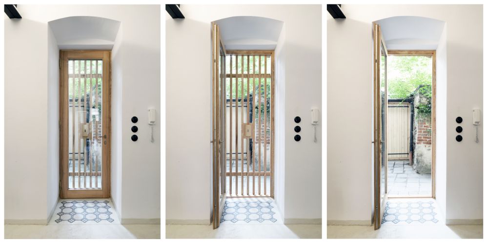 Zadáním bylo vytvořit byt na míru pro pár. To nám umožnilo vytvořit řešení, která by ve větší domácnosti nebyla myslitelná. Byt nemá standardní koupelnu, ta je součástí ložnice skrytá za příčkou/paravánem tvořeným masivním rámem z HEB profilů. Díky tomu bylo možné nechat původní výmalbu stropu odhalenou jako celek. Přestože je byt poměrně malý, místnosti působí velmi rozlehle, prostor není třeba dělit.