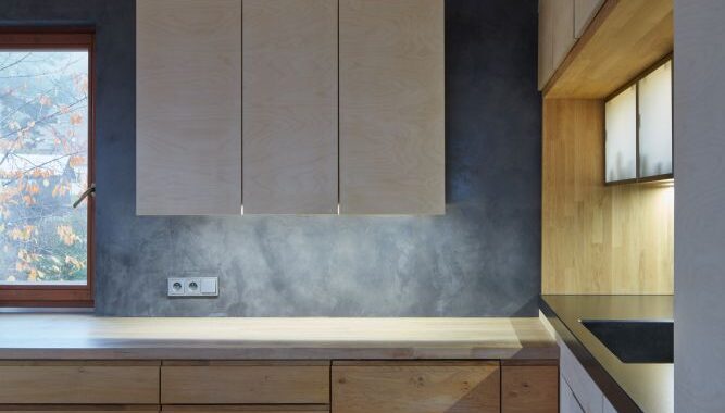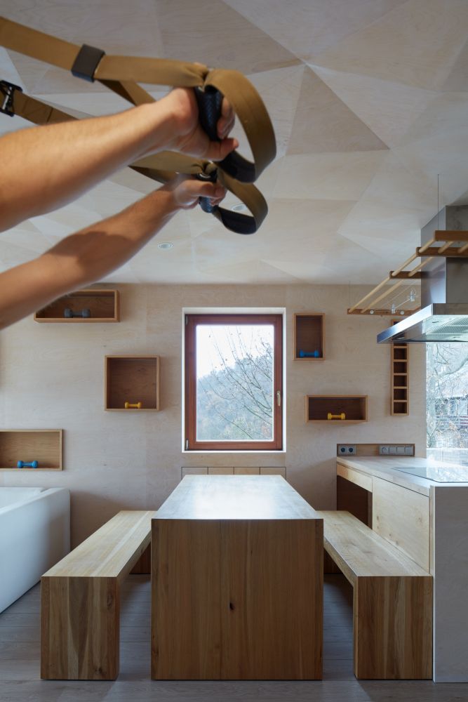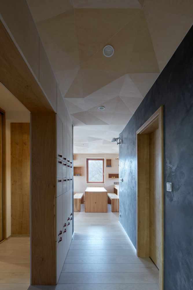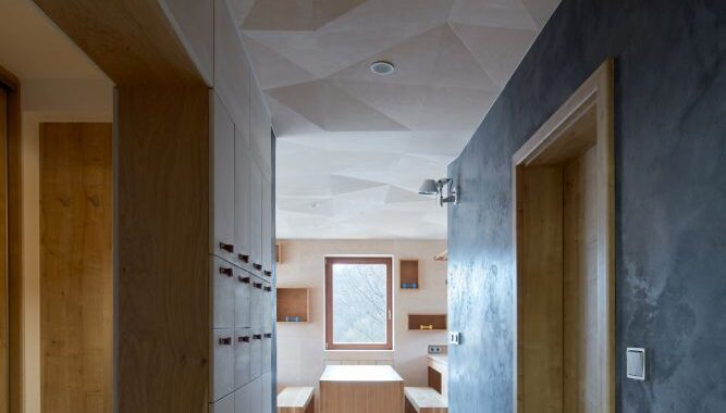 Klient si oblíbil vnitřní vybavení chalup, které jsou rozesety po kopcích v krajině Českého Středohoří a prosluněné usedlosti v Provence. Cílem bylo spojit tyto dva inspirační zdroje v kompaktní celek. Naším záměrem bylo neopakovat zavedené architektonické postupy a fráze, ale vytvořit unikátní a současnou odpověď na jeho požadavky. Návrh spojuje tyto dvě specifické atmosféry – z chalup jsme si vzali interiér v podobě masivního nábytku, z Provence práci se světlem. Výběr materiálů a barev koresponduje jak s inspiračními zdroji, tak s tóny okolní přírody. Jedná se o tmavou cementovou stěrku, dubové dřevo a bělenou březovou překližku.
