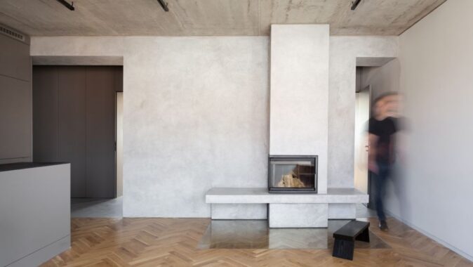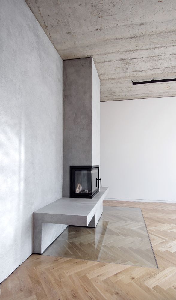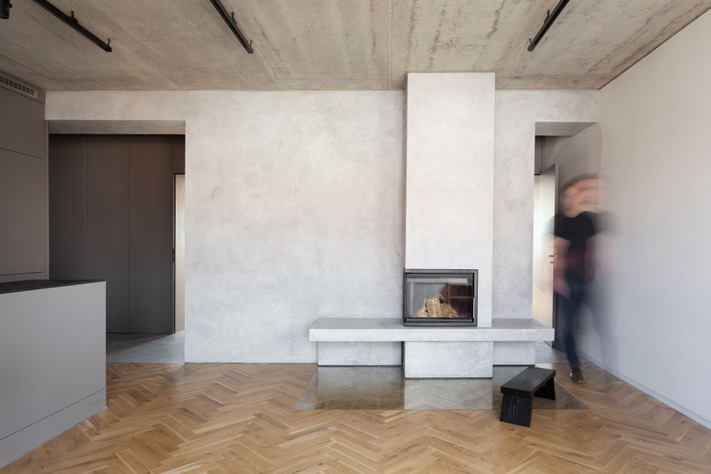 Byt se nachází ve třetím patře domu z padesátých let 20. století. Klienti si přáli vytvořit nadstandartní bydlení s dobrým akustickým komfortem. Vrstvy dodatečných stavebních úprav z minulosti jsme očistili, nekvalitní omítku osekali a vybourali nadbytečné příčky. Při těchto úpravách byl odhalen systém prefabrikovaných betonových panelů stropní konstrukce. Byly vyspraveny, ponechali jsme je jako výrazný estetický prvek.