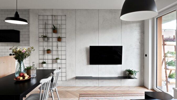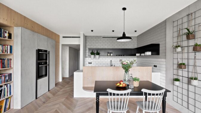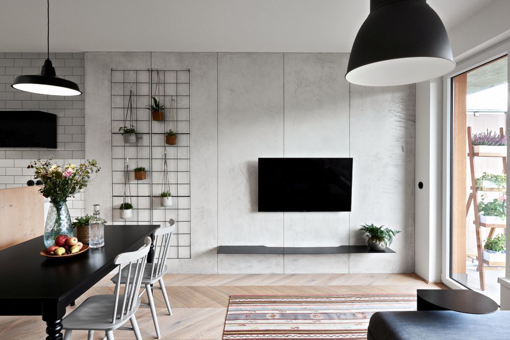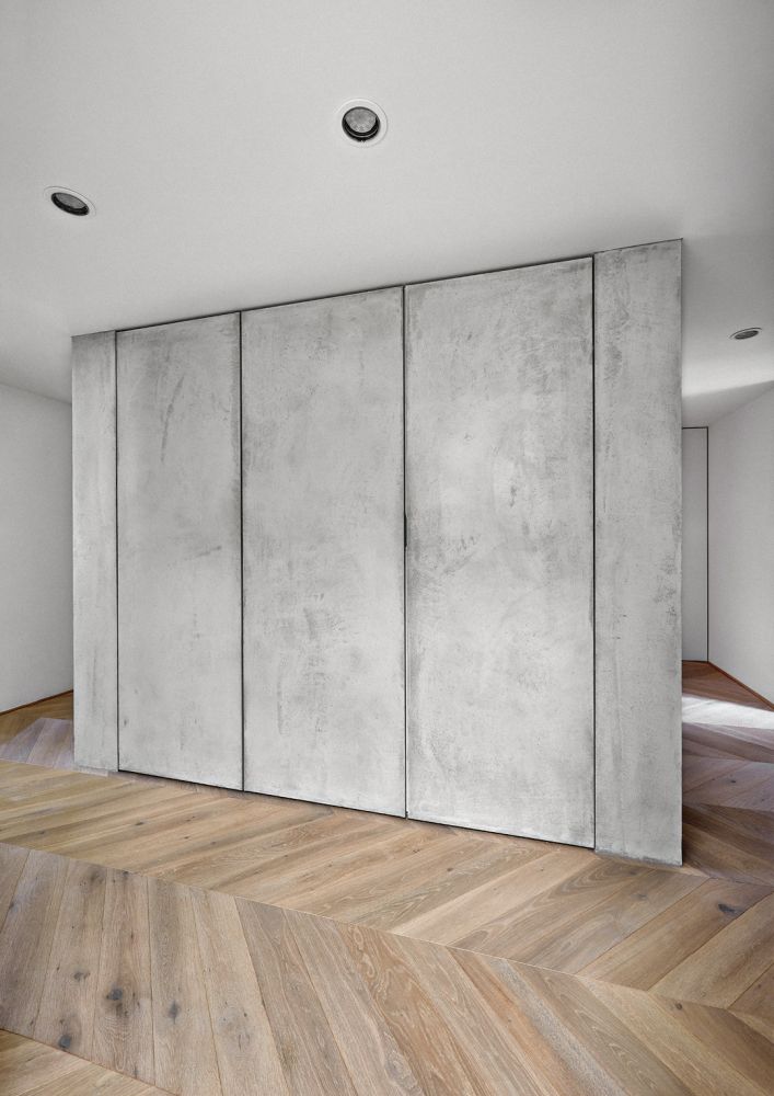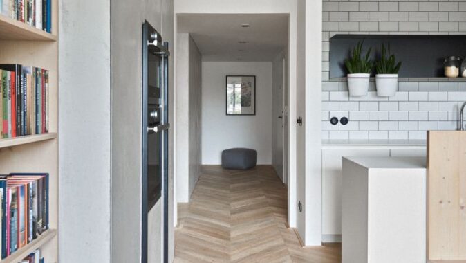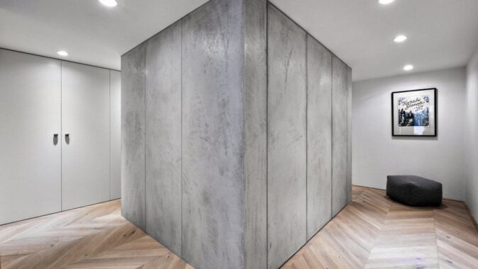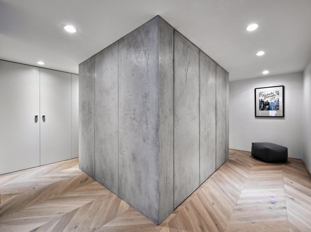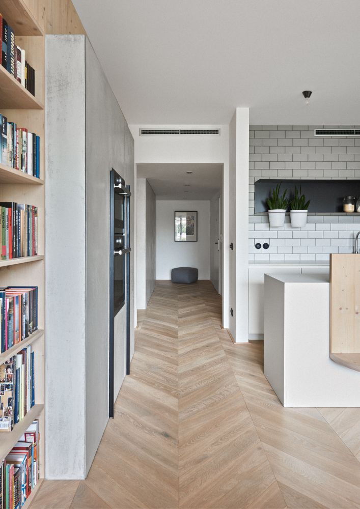 Návrh nové dispozice byl postaven na tématu centrální haly. Zde je vstup do bytu, odsud se vchází do všech místností, tady jsou hlavní úložné prostory, prádelna, WC a koupelna. Výjimkou, jež potvrzuje pravidlo, se stala ložnice, která zůstala skrytá.