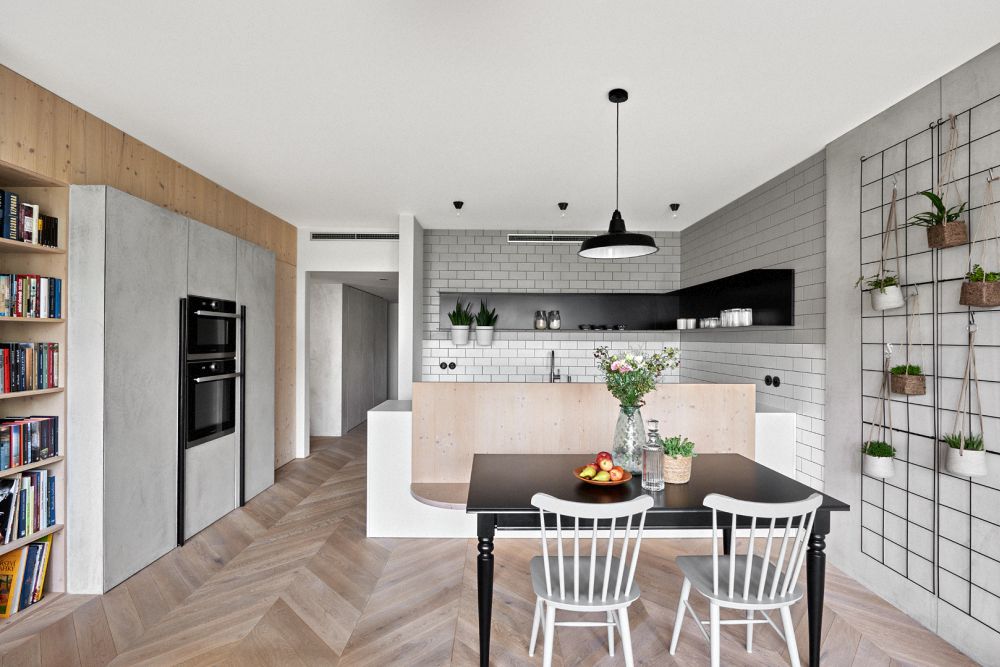 Hala, ne chodby. Průhledy a tak nějak jinak řešené dveře. Parketová podlaha a stůl jako srdce domova. U jídla se lidé ráno scházejí, večer probírají svůj den. Kuchyň je obývacím pokojem a v obývacím pokoji se vaří.