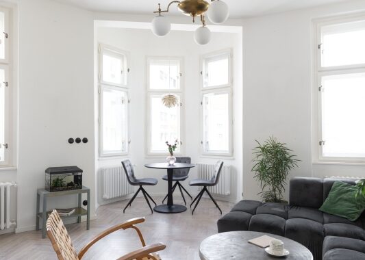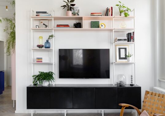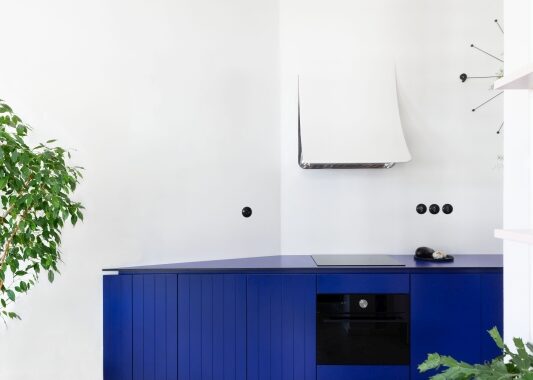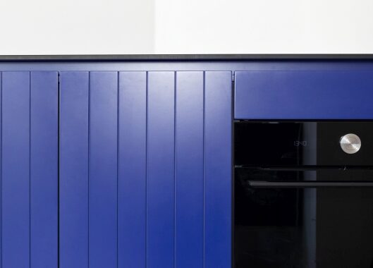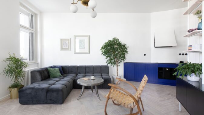 Nově vzniklé 3+kk se nebojí barev ani nevšedních nápadů. Dominantou a ústředním motivem celého bytu je tmavě modrá barva na kuchyňské lince. Výrazná barva je doplněna jemnou pudrově růžovou, která výrazné modré nekonkuruje; naopak ji jemně podtrhuje a doplňuje. Je použita například na „kredenci“/knihovně, která prochází prosklenou stěnou oddělující kuchyni od ložnice. Díky prosklení se nám mimo jiné podařilo byt prosvětlit a dostat tak světlo i do kuchyňské části, která by jinak zůstala tmavá.