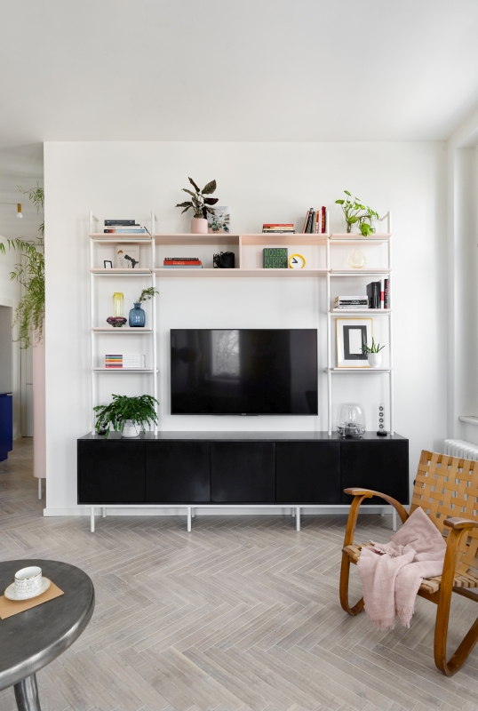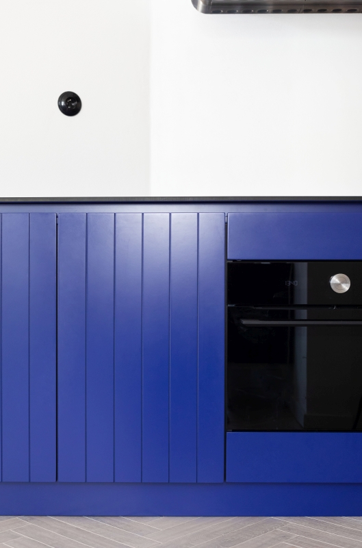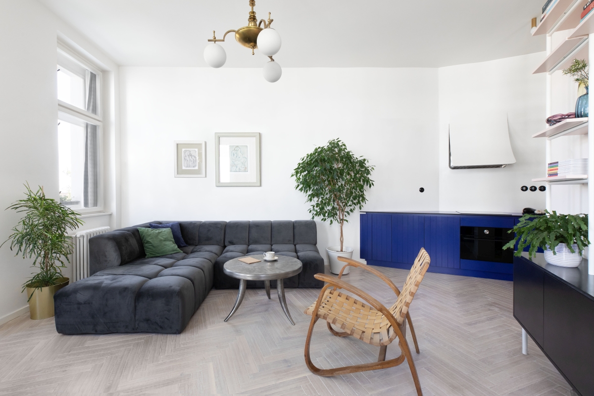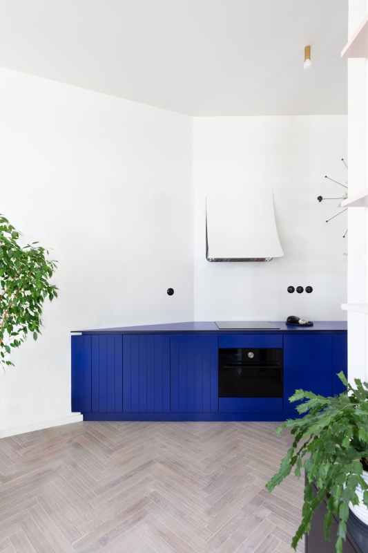 Nově vzniklé 3+kk se nebojí barev ani nevšedních nápadů. Dominantou a ústředním motivem celého bytu je tmavě modrá barva na kuchyňské lince. Výrazná barva je doplněna jemnou pudrově růžovou, která výrazné modré nekonkuruje; naopak ji jemně podtrhuje a doplňuje. Je použita například na „kredenci“/knihovně, která prochází prosklenou stěnou oddělující kuchyni od ložnice. Díky prosklení se nám mimo jiné podařilo byt prosvětlit a dostat tak světlo i do kuchyňské části, která by jinak zůstala tmavá.
